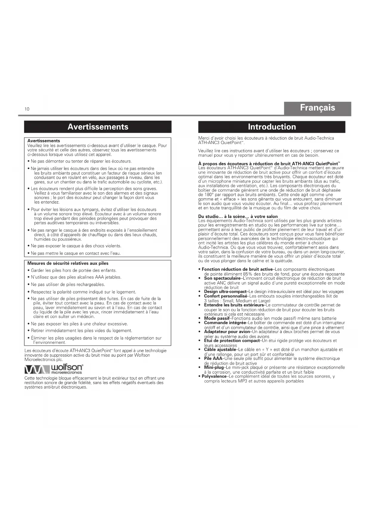 font appel à une technologie innovante de suppression active du bruit mise au point par Wolfson Microelectronics plc. Cette technologie bloque efficacement le bruit extérieur tout en offrant une restitution sonore de grande fidélité, sans les effets négatifs éventuels des systèmes anti-bruit électroniques. 10Français Écouteurs à réduction de bruit ATH-ANC3 QuietPoint