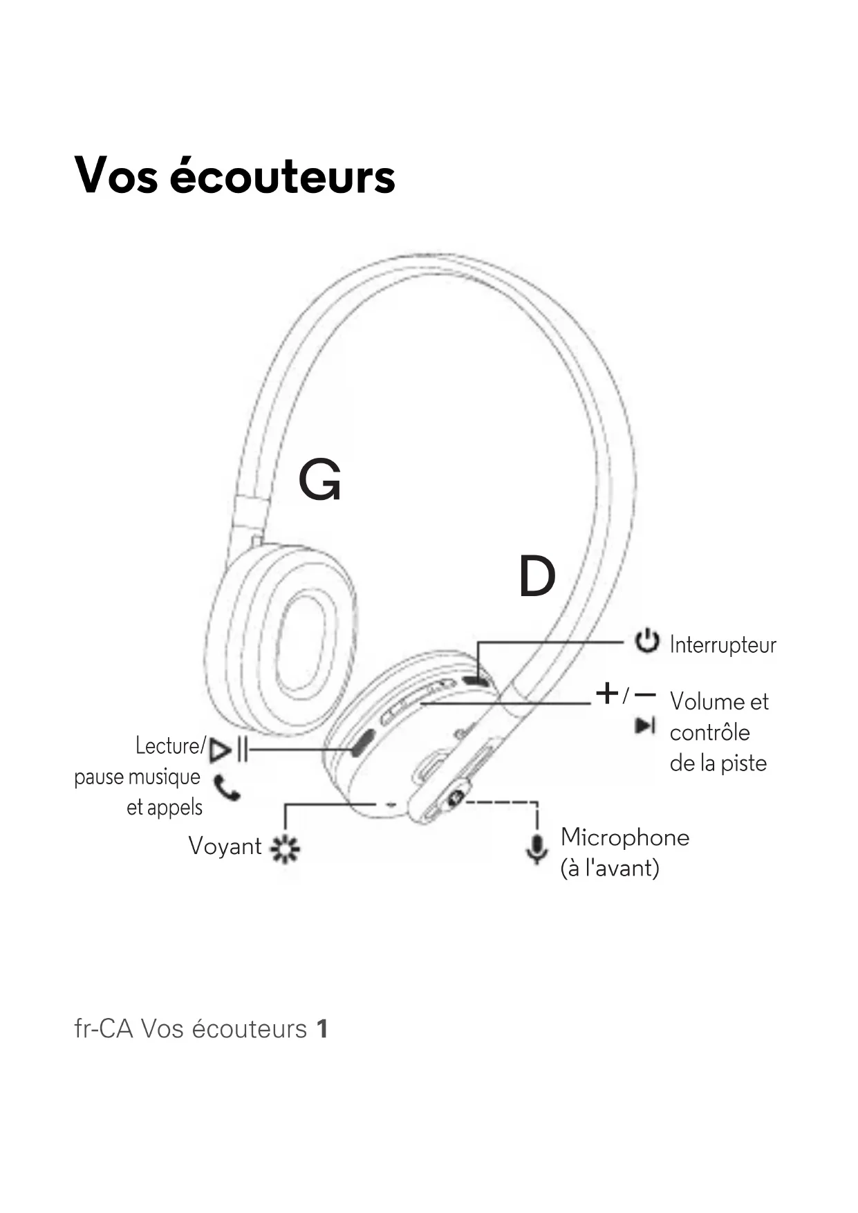 - Verte: Élevée, 71 à 100 % Remarque : Votre batterie est conçue pour fonctionner pendant toute la durée de vie utile du produit. Elle ne doit être retirée que par une entreprise de recyclage. Toute tentative de retirer ou de remplacer la batterie pourrait causer des dommages au produit et pourrait annuler la garantie. Appuyez simultanément sur + et - pour vérier le niveau de charge (alors qu'aucun appel n'est en cours).fr-CA Avancé 11 Réinitialisation Désactivez Bluetooth pour tous les appareils connectés. Allumez les écouteurs, puis maintenez enfoncés les trois boutons jusqu'à ce que le voyant d'état clignote alternativement en rouge et en bleu. Vous entendrez une tonalité. Maintenez enfoncés ces trois boutons pour réinitialiser.12 Avancé fr-CA Second appareil Utilisez-vous un téléphone et une tablette? Connectez les deux à la fois. 1 Associez votre premier appareil en suivant les étapes de la section « Association avec Bluetooth™ » à la page 5. 2 Désactivez Bluetooth sur votre premier appareil (votre téléphone, votre tablette ou votre ordinateur). 3 Éteignez les écouteurs. Puis rallumez-les. 4 Associez votre second appareil en suivant les étapes de la section « Association avec Bluetooth™ » à la page 5. 5 Sur votre premier appareil, réactivez Bluetooth pour le connecter simultanément. Vous entendrez une tonalité lorsque le premier appareil sera connecté. Conseil : Pour passer à la musique du second appareil, arrêtez le lecteur de musique actuel, puis appuyez sur la touche de lecture du second appareil.fr-CA Aide 13 Aide
