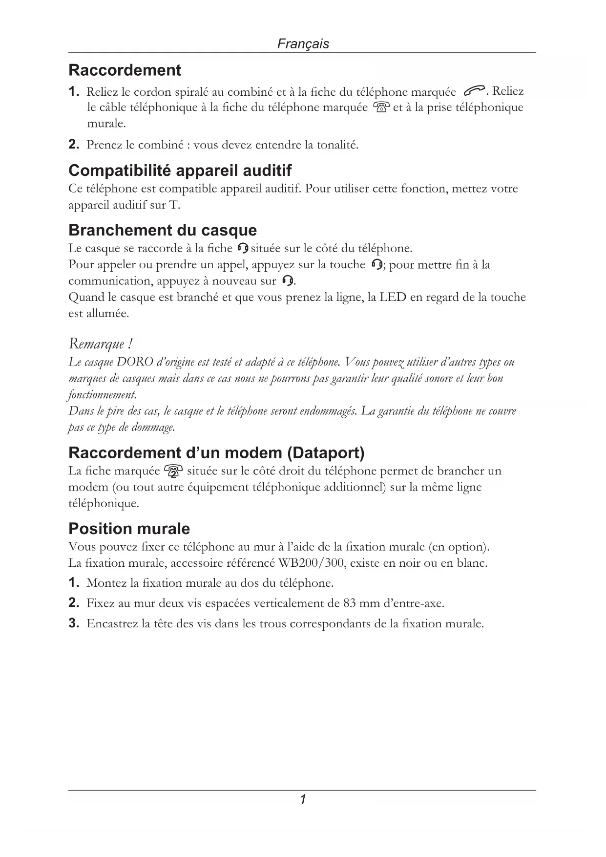 Quand le casque est branché et que vous prenez la ligne, la LED en regard de la touche est allumée. Remarque ! Le casque DORO d’origine est testé et adapté à ce téléphone. Vous pouvez utiliser d’autres types ou marques de casques mais dans ce cas nous ne pourrons pas garantir leur qualité sonore et leur bon fonctionnement. Dans le pire des cas, le casque et le téléphone seront endommagés. La garantie du téléphone ne couvre pas ce type de dommage. Raccordement d’un modem (Dataport) La che marquée 8 située sur le côté droit du téléphone permet de brancher un modem (ou tout autre équipement téléphonique additionnel) sur la même ligne téléphonique. Position murale Vous pouvez xer ce téléphone au mur à l’aide de la xation murale (en option). La xation murale, accessoire référencé WB200/300, existe en noir ou en blanc.