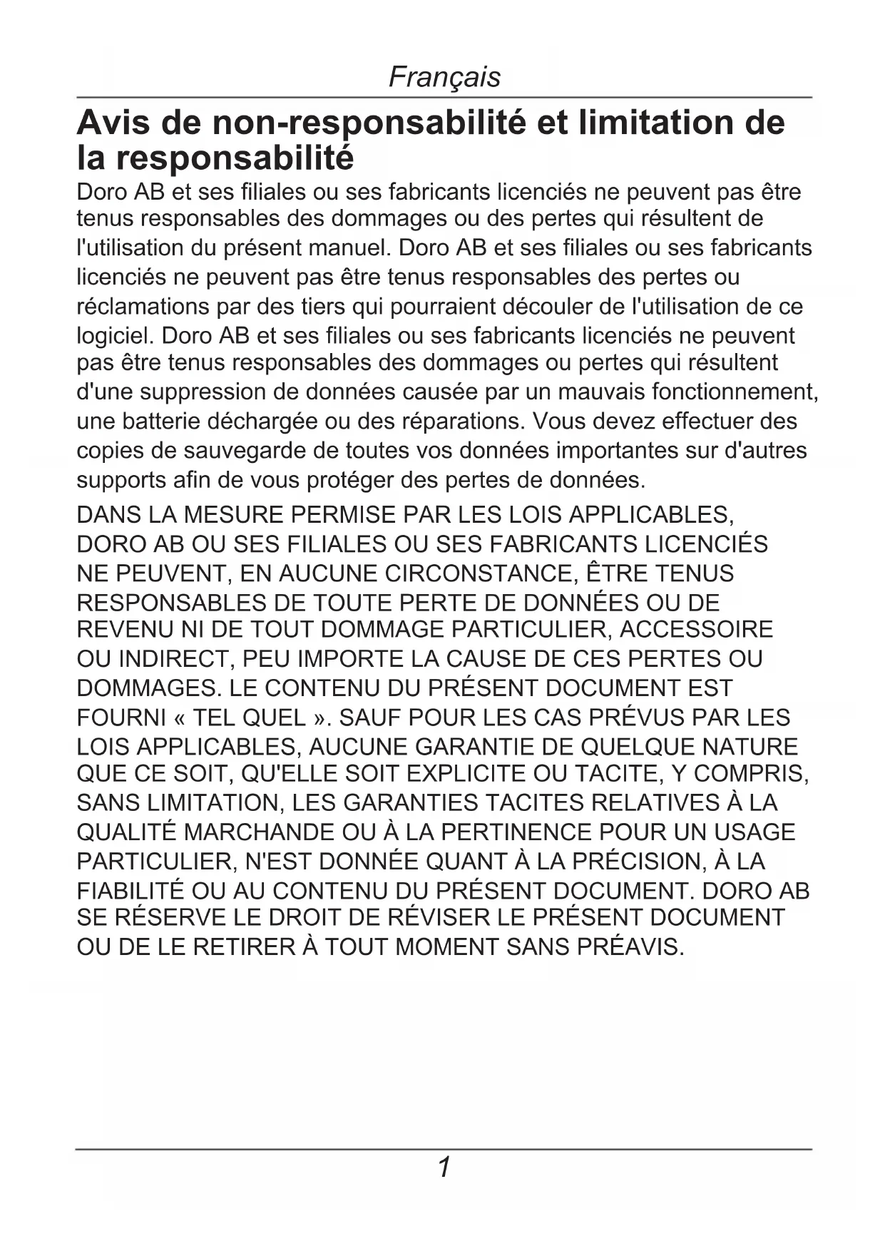 L'appareil contient des transmetteurs et récepteurs radio. Lorsqu'il est allumé, votre téléphone reçoit et envoie de l'énergie radiofréquence (RF) à travers son antenne. L'appareil est conçu et fabriqué pour qu'il ne dépasse pas les limites d'exposition d'énergie RF déterminées par la FCC. • Cette norme d'exposition fait usage d'une unité de mesure appelée le taux d'absorption spécifique ou TAS. La limite TAS, fixée par la FCC, qui s'applique à l'appareil HandlePlus 326i gsm est de 1,6 watt par kilo (W/kg). Les tests de TAS sont effectués en positions d'utilisation standards (c'est-à-dire, à l'oreille et porté sur le corps) spécifiées par la FCC, lorsque le HandlePlus 326i gsm transmet à son niveau de puissance certifié le plus élevé dans toutes les bandes de fréquence testées. Même si le TAS est déterminé à son niveau de puissance certifié le plus élevé, le niveau TAS réel du HandlePlus 326i gsm, lorsqu'il fonctionne, peut être bien en dessous de la valeur maximale parce que le HandlePlus 326i gsm ajuste sa puissance de transmission, en partie, selon la proximité du réseau sans fil. En règle générale, plus vous êtes proche d'un point d'accès sans fil, plus le niveau de puissance sera bas. Le HandlePlus 326i gsm a été testé et il est conforme aux normes d'exposition RF de la FCC concernant l'utilisation des cellulaires. Lorsque le HandlePlus 326i gsm est testé pour une utilisation à l'oreille, sa valeur TAS la plus élevée est de 0,69 W/kg. Lorsqu'il est testé pour une utilisation avec l'appareil fixé au corps, avec le HandlePlus 326i gsm positionné à 2,2 cm (0,87 pouce) du corps, sa valeur TAS la plus élevée est de 0,64 W/kg. Pour une utilisation avec l'appareil fixé au corps, la mesure de TAS du HandlePlus 326i gsm peut dépasser les normes d'exposition du FCC s'il est positionné à moins de 2,2 cm (0,87 pouce) du corps. Pour une performance optimale du dispositif et pour s'assurer que l'exposition humaine à l'énergie RF ne dépasse pas les limites fixées par la FCC, il faut toujours suivre les instructions et précautions suivantes : Lorsque vous faites un appel avec le récepteur audio intégré dans l'appareil, maintenez l'appareil pointé vers votre épaule afin d'augmenter la distance avec l'antenne. Pour une utilisation avec l'appareil fixé au28 Français corps, il faut maintenir le HandlePlus 326i gsm au moins à 2,2 cm (0,87 pouce) du corps, et il ne faut utiliser que des étuis, des pinces de ceinture ou des supports qui ne contiennent pas de pièces en métal et qui maintiennent l'appareil à au moins 2,2 cm (0,87 pouce) du corps. Si vous vous inquiétez toujours de l'exposition à l'énergie RF, vous pouvez limiter encore plus l'exposition en limitant le temps d'utilisation du HandlePlus 326i gsm, étant donné que le temps est un facteur qui influe sur la quantité d'exposition que reçoit une personne, et en augmentant la distance entre l'appareil et votre corps, étant donné que le niveau d'exposition diminue considérablement avec la distance. Compatibilité avec les aides auditives Le Hearing Aid Compatibility Act of 1988 et les règlements de la FCC promulgués dans le cadre de cette loi indiquent les exigences minimales relatives à la compatibilité aux aides auditives pour les téléphones portables GSM en vente aux États-Unis. Les règlements de la FCC exigent que, à partir du 6 juin 2008, tous les fabricants de combinés qui distribuent plus de deux modèles de téléphones cellulaires aux États-Unis doivent au moins se conformer à la norme « M3 » (telle que définie dans la norme de l'American National Standard Institute (ANSI)) pour un tiers des combinés qui sont proposés aux fournisseurs de service par interface radio numérique. Pour le couplage inductif, chaque fabricant de combinés doit proposer aux fournisseurs de service au moins deux modèles de combinés notés « T3 » par interface radio numérique. Le HandlePlus 326i gsm n'est pas compatible avec les aides auditives selon la norme ANSI ou les règlements de la FCC et peut causer des interférences avec certaines aides auditives. Doro AB, fabricant de cet appareil, est exempté des règlements concernant la compatibilité avec les aides auditives de la FCC en ce moment. L'utilisation du Doro HearPlus eh346m EarHook peut supprimer ce problème pour des aides auditives ayant une position en « T ». En cas d'interférence, veuillez consulter votre opérateur. Identification FCC : WS5DORO326328G29 Français Garantie Cet appareil est garanti pour une période de 12 mois à partir de sa date d'achat. Dans le cas peu probable d'une panne durant cette période, contactez le revendeur. Une preuve d'achat sera demandée pour toute intervention du service après-vente sollicitée pendant la période de garantie. Cette garantie ne s'appliquera pas en cas de défaillance causée par un accident ou un incident ou dommage similaire, la pénétration de liquide, une négligence, un usage inadapté, un entretien inadéquat ou toute autre circonstance causée par la négligence de l'utilisateur. En outre, cette garantie ne s'appliquera pas en cas de défaillance causée par la foudre ou toute autre variation de tension. Par précaution, nous recommandons de débrancher l'appareil en cas d'orage. Les batteries sont des consommables et ne sont couvertes par aucune garantie. Cette garantie ne s'applique pas en cas d'utilisation de batteries autres que les batteries originales DORO. Remarque : Cette garantie n'a aucune incidence sur vos droits légaux selon les lois nationales applicables relatives à la vente de produits de consommation. Support Si vous avez besoin d’assistance aux Etats-Unis: Tel.: 1-888-551-doro (1-888-551-3676) TTY/TDD: 1-888-561-doro (1-888-561-3676) E-Mail: support.usa@doro.com Pour plus d’informations, visitez: www.doro.com Spécifications Réseau : GSM 850/1800/1900 tripler bande Dimensions : 135 mm x 58,5 mm x 16 mm (