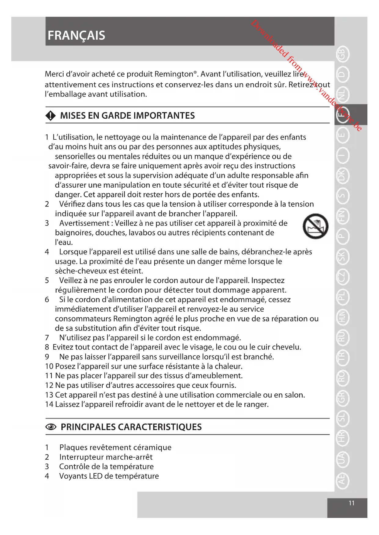 1 L’utilisation, le nettoyage ou la maintenance de l’appareil par des enfants d’au moins huit ans ou par des personnes aux aptitudes physiques, sensoriellesoumentalesréduitesouunmanqued’expérienceoude savoir-faire, devra se faire uniquement après avoir reçu des instructions appropriéesetsouslasupervisionadéquated’unadulteresponsablean d‘assurerunemanipulationentoutesécuritéetd’évitertoutrisquede danger.Cetappareildoitresterhorsdeportéedesenfants. 2 Vériezdanstouslescasquelatensionàutilisercorrespondeàlatension indiquéesurl'appareilavantdebrancherl'appareil. 3 Avertissement:Veillezànepasutilisercetappareilàproximitéde baignoires,douches,lavabosouautresrécipientscontenantde l'eau. 4 Lorsquel’appareilestutilisédansunesalledebains,débranchez-leaprès usage.Laproximitédel’eauprésenteundangermêmelorsquele sèche-cheveuxestéteint. 5 Veillezànepasenroulerlecordonautourdel'appareil.Inspectez régulièrementlecordonpourdétectertoutdommageapparent. 6 Silecordond'alimentationdecetappareilestendommagé,cessez immédiatementd'utiliserl'appareiletrenvoyez-leauservice consommateursRemingtonagrééleplusprocheenvuedesaréparationou desasubstitutionand'évitertoutrisque. 7 N’utilisezpasl’appareilsilecordonestendommagé. 8 Evitez tout contact de l’appareil avec le visage, le cou ou le cuir chevelu. 9 Nepaslaisserl’appareilsanssurveillancelorsqu’ilestbranché. 10Posezl’appareilsurunesurfacerésistanteàlachaleur. 11 Ne pas placer l’appareil sur des tissus d’ameublement. 12 Ne pas utiliser d’autres accessoires que ceux fournis. 13Cetappareiln’estpasdestinéàuneutilisationcommercialeouensalon. 14 Laissez l’appareil refroidir avant de le nettoyer et de le ranger.