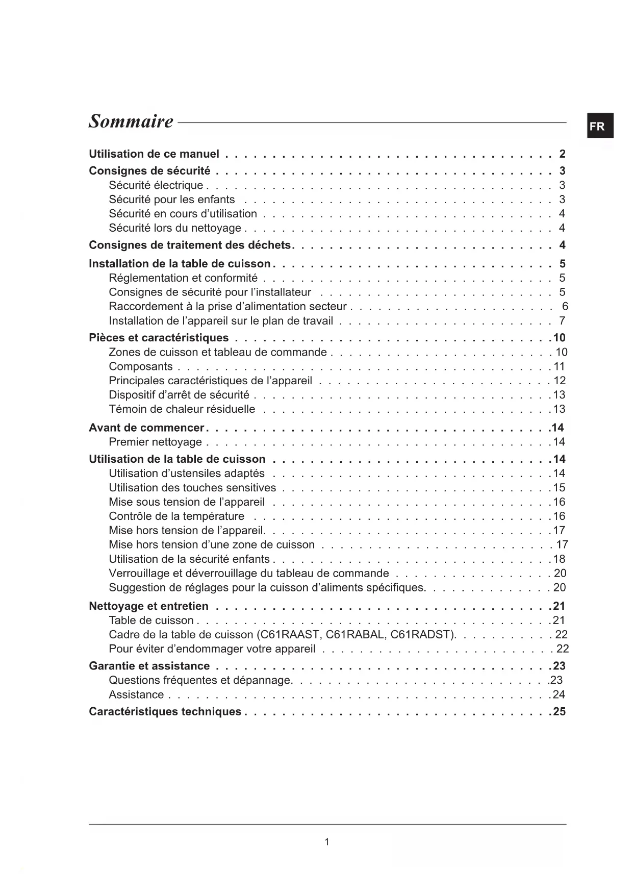 Consignes d’installation et d’utilisation Table de cuisson en vitrocéramique C61RAAST / C61RABAL / C61RACN / C61RADST Afin d’éviter tout risque d’accident ou de détérioration du matériel, lisez attentivement ces instructions avant d’installer ou d’utiliser l’appareil. Conservez soigneusement ce manuel en vue d’une consultation ultérieure. C Top_MID] C61RAAST_XSG-00129A_FR.indd 1 2007-10-09 ソタタ・11:23:01C Top_MID] C61RAAST_XSG-00129A_FR.indd 2 2007-10-09 ソタタ・11:23:01FR