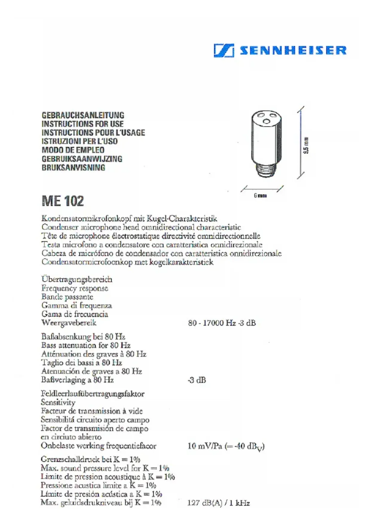 ME 102Ant - Microphone SENNHEISER - Notice d'utilisation et mode d'emploi gratuit