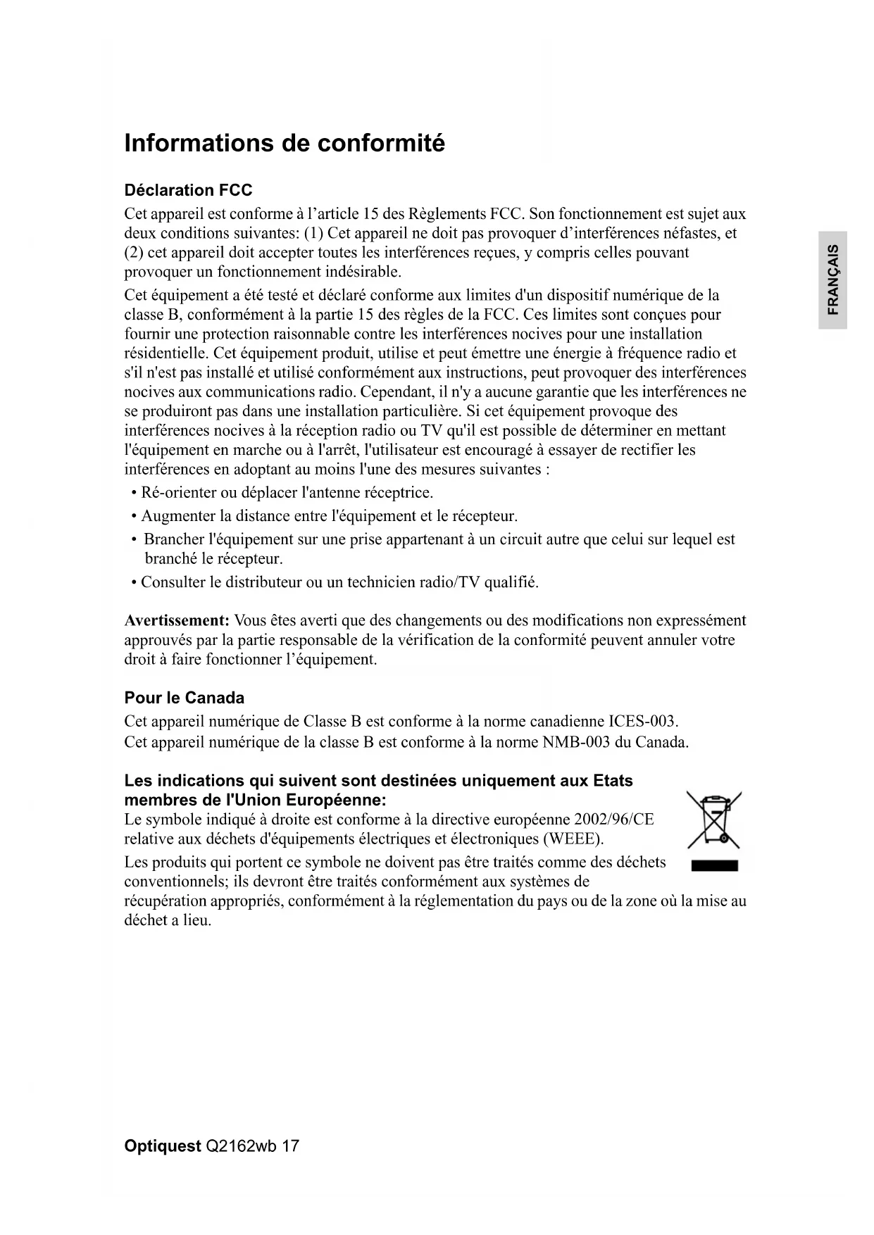 approuvés par la partie responsable de la vérification de la conformité peuvent annuler votre droit à faire fonctionner l’équipement. Pour le Canada Cet appareil numérique de Classe B est conforme à la norme canadienne ICES-003. Cet appareil numérique de la classe B est conforme à la norme NMB-003 du Canada. Les indications qui suivent sont destinées uniquement aux Etats membres de l'Union Européenne: Le symbole indiqué à droite est conforme à la directive européenne 2002/96/CE relative aux déchets d'équipements électriques et électroniques (WEEE). Les produits qui portent ce symbole ne doivent pas être traités comme des déchets conventionnels; ils devront être traités conformément aux systèmes de récupération appropriés, conformément à la réglementation du pays ou de la zone où la mise au déchet a lieu.18 Optiquest Q2162wb FRANÇAIS Importantes instructions de sécurité