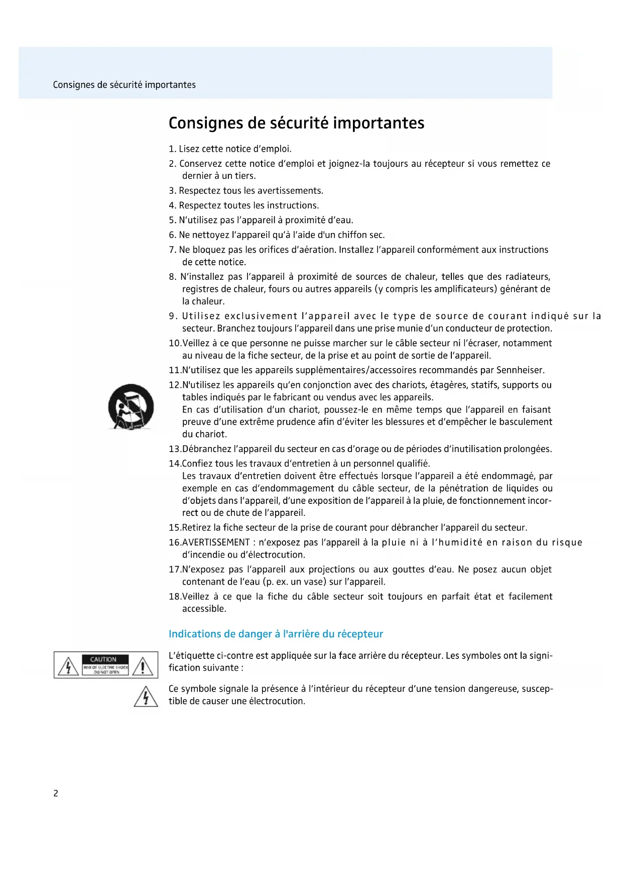 secteur. Branchez toujours l’appareil dans une prise munie d’un conducteur de protection. 10.Veillez à ce que personne ne puisse marcher sur le câble secteur ni l’écraser, notamment au niveau de la fiche secteur, de la prise et au point de sortie de l’appareil. 11.N’utilisez que les appareils supplémentaires/accessoires recommandés par Sennheiser. 12.N'utilisez les appareils qu’en conjonction avec des chariots, étagères, statifs, supports ou tables indiqués par le fabricant ou vendus avec les appareils. En cas d’utilisation d’un chariot, poussez-le en même temps que l’appareil en faisant preuve d’une extrême prudence afin d’éviter les blessures et d’empêcher le basculement du chariot. 13.Débranchez l’appareil du secteur en cas d’orage ou de périodes d’inutilisation prolongées. 14.Confiez tous les travaux d’entretien à un personnel qualifié. Les travaux d’entretien doivent être effectués lorsque l’appareil a été endommagé, par exemple en cas d’endommagement du câble secteur, de la pénétration de liquides ou d’objets dans l’appareil, d’une exposition de l’appareil à la pluie, de fonctionnement incor- rect ou de chute de l’appareil. 15.Retirez la fiche secteur de la prise de courant pour débrancher l’appareil du secteur. 16.AVERTISSEMENT : n’exposez pas l’appareil à la pluie ni à l’humidité en raison du risque d’incendie ou d’électrocution. 17.N’exposez pas l’appareil aux projections ou aux gouttes d’eau. Ne posez aucun objet contenant de l’eau (p. ex. un vase) sur l’appareil. 18.Veillez à ce que la fiche du câble secteur soit toujours en parfait état et facilement accessible. Indications de danger à l'arrière du récepteur L’étiquette ci-contre est appliquée sur la face arrière du récepteur. Les symboles ont la signi- fication suivante : Ce symbole signale la présence à l’intérieur du récepteur d’une tension dangereuse, suscep- tible de causer une électrocution.Consignes de sécurité importantes