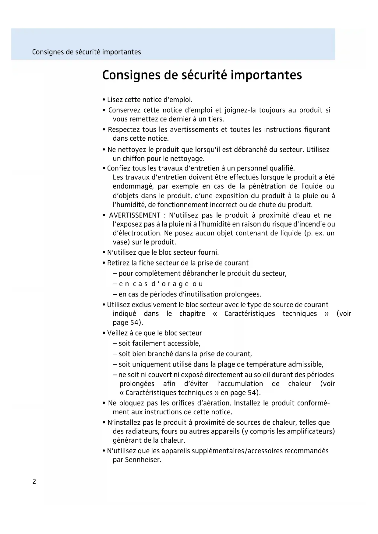 - N’utilisez que les appareils supplémentaires/accessoires recommandés par Sennheiser.Consignes de sécurité importantes