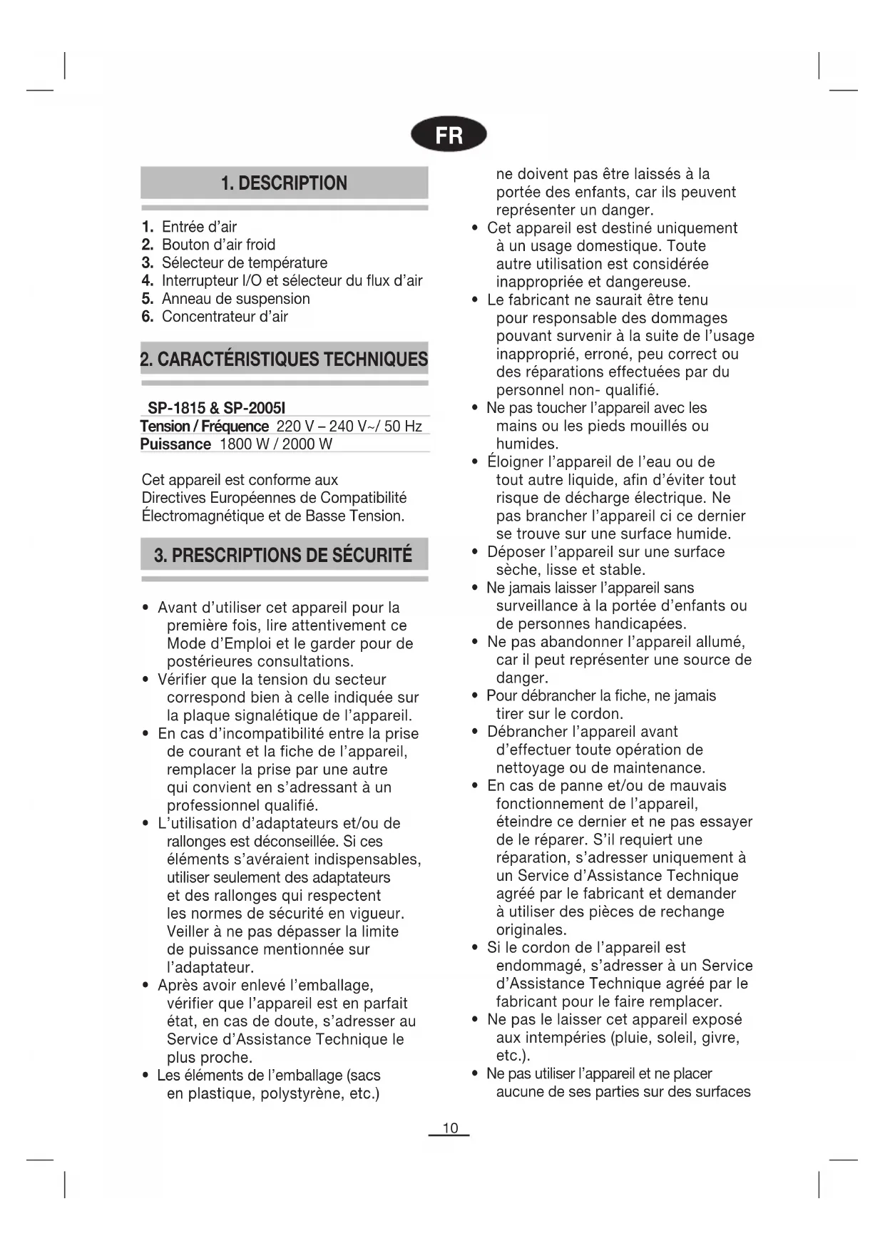 SP-1815 & SP-2005I Tension / Fréquence 220 V – 240 V~/ 50 Hz Puissance 1800 W / 2000 W11 chaudes ou près de celles-ci (plaques de cuisson à gaz ou électriques ou fours).