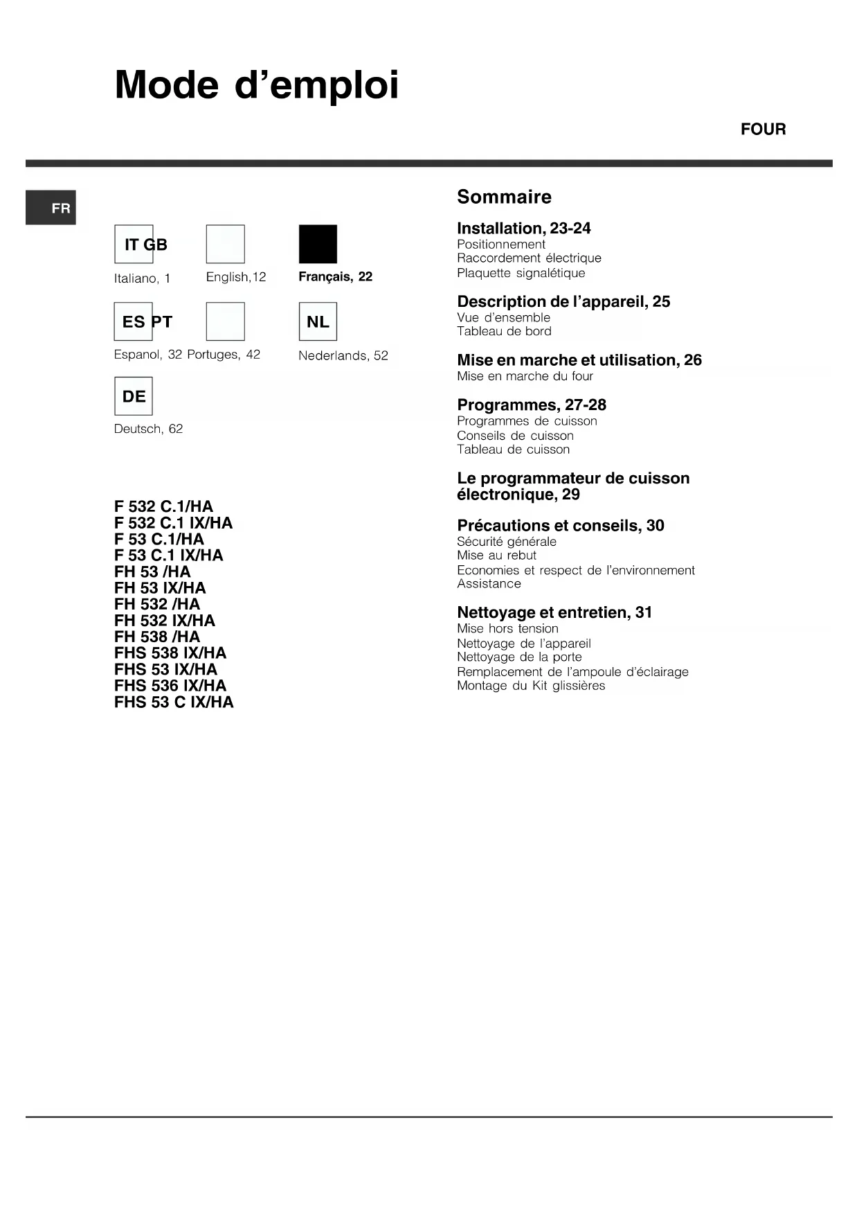 Sommaire Installation, 23-24 Positionnement Raccordement électrique Plaquette signalétique Description de l’appareil, 25 Vue d’ensemble Tableau de bord Mise en marche et utilisation, 26 Mise en marche du four Programmes, 27-28 Programmes de cuisson Conseils de cuisson Tableau de cuisson Le programmateur de cuisson électronique, 29 Précautions et conseils, 30 Sécurité générale Mise au rebut Economies et respect de l’environnement Assistance Nettoyage et entretien, 31 Mise hors tension Nettoyage de l’appareil Nettoyage de la porte Remplacement de l’ampoule d’éclairage Montage du Kit glissières Mode d’emploi FOUR Français, 22 Espanol, 32 Portuges, 42 ES PT Deutsch, 62