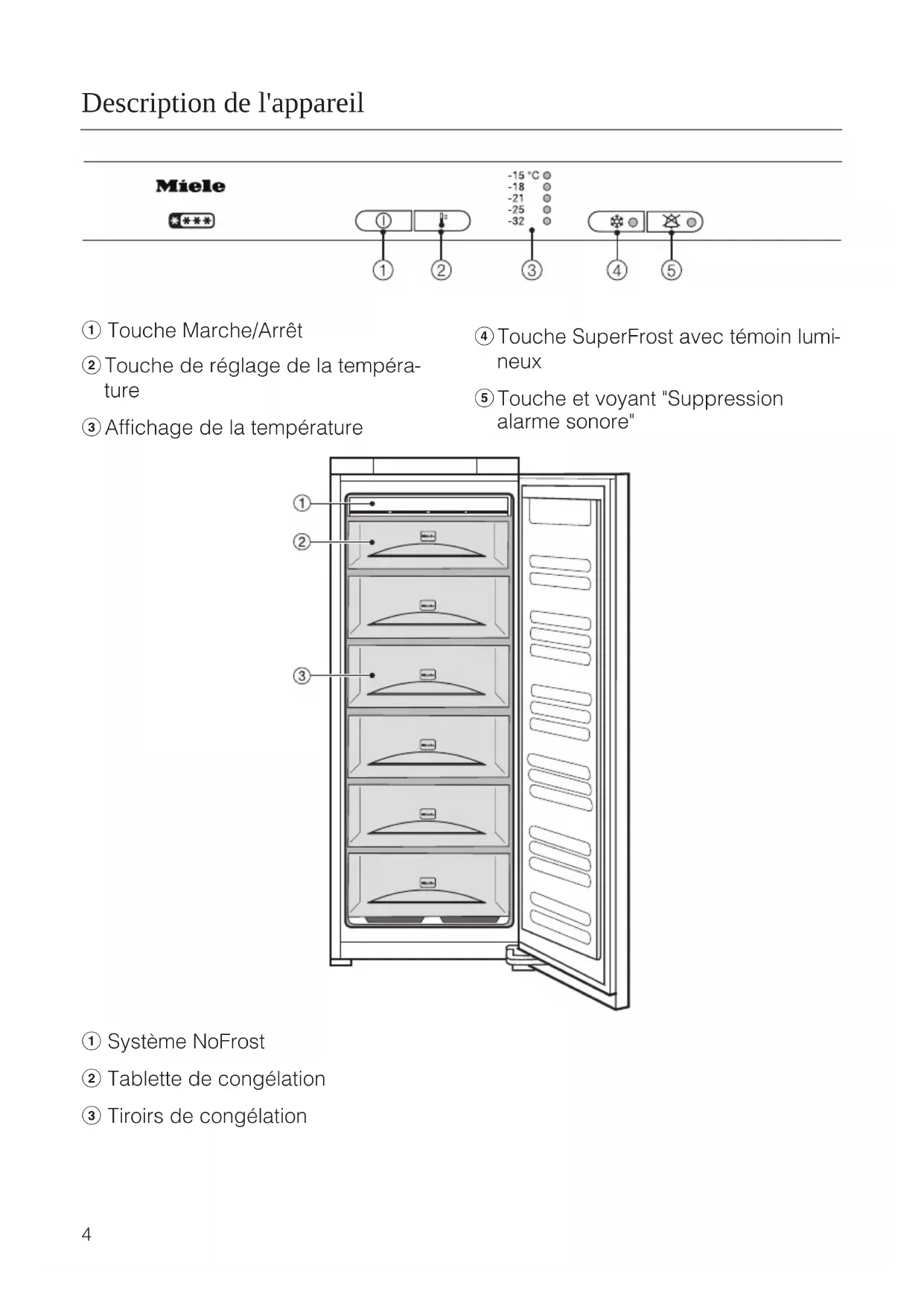 ture c Affichage de la température a Système NoFrost b Tablette de congélation c Tiroirs de congélation d Touche SuperFrost avec témoin lumi