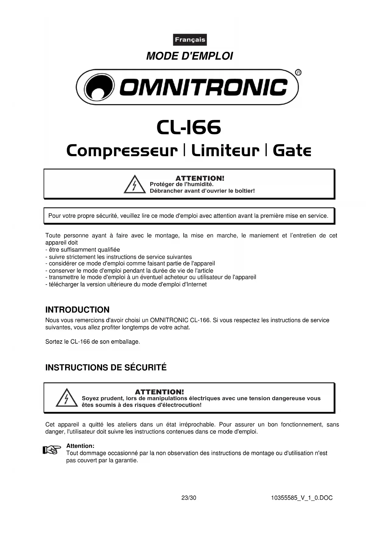 MODE D'EMPLOI CL166 Omnitronic