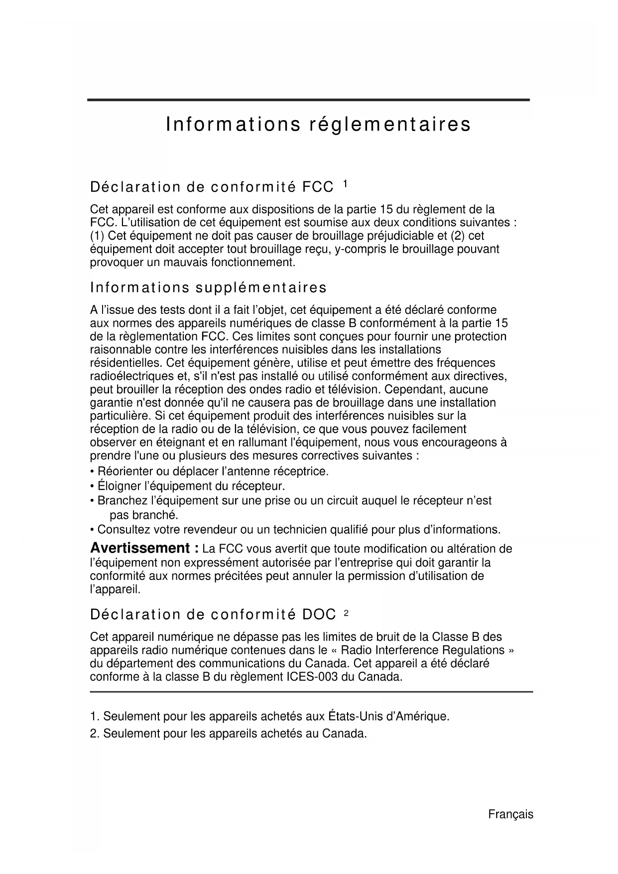 Cet appareil est conforme aux dispositions de la partie 15 du règlement de la FCC. L’utilisation de cet équipement est soumise aux deux conditions suivantes : (1) Cet équipement ne doit pas causer de brouillage préjudiciable et (2) cet équipement doit accepter tout brouillage reçu, y-compris le brouillage pouvant provoquer un mauvais fonctionnement. Informations supplémentaires A l’issue des tests dont il a fait l’objet, cet équipement a été déclaré conforme aux normes des appareils numériques de classe B conformément à la partie 15 de la règlementation FCC. Ces limites sont conçues pour fournir une protection raisonnable contre les interférences nuisibles dans les installations résidentielles. Cet équipement génère, utilise et peut émettre des fréquences radioélectriques et, s'il n'est pas installé ou utilisé conformément aux directives, peut brouiller la réception des ondes radio et télévision. Cependant, aucune garantie n'est donnée qu'il ne causera pas de brouillage dans une installation particulière. Si cet équipement produit des interférences nuisibles sur la réception de la radio ou de la télévision, ce que vous pouvez facilement observer en éteignant et en rallumant l'équipement, nous vous encourageons à prendre l'une ou plusieurs des mesures correctives suivantes :