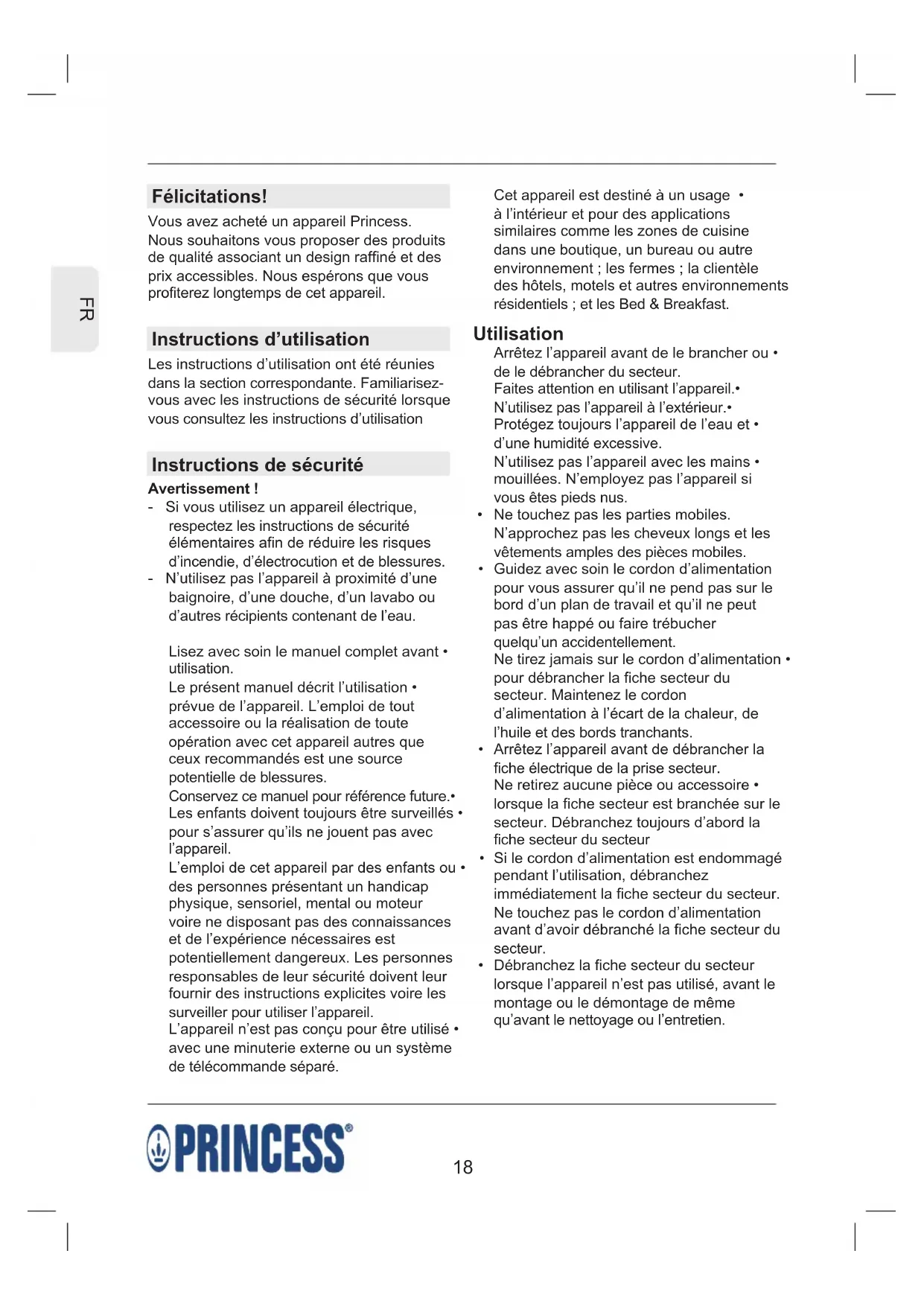 Félicitations! Vous avez acheté un appareil Princess. Nous souhaitons vous proposer des produits de qualité associant un design raffiné et des prix accessibles. Nous espérons que vous profiterez longtemps de cet appareil. Instructions d’utilisation Les instructions d’utilisation ont été réunies dans la section correspondante. Familiarisez- vous avec les instructions de sécurité lorsque vous consultez les instructions d’utilisation Instructions de sécurité Avertissement ! - Si vous utilisez un appareil électrique, respectez les instructions de sécurité élémentaires afin de réduire les risques d’incendie, d’électrocution et de blessures. - N’utilisez pas l’appareil à proximité d’une baignoire, d’une douche, d’un lavabo ou d’autres récipients contenant de l’eau. Lisez avec soin le manuel complet avant • utilisation. Le présent manuel décrit l’utilisation • prévue de l’appareil. L’emploi de tout accessoire ou la réalisation de toute opération avec cet appareil autres que ceux recommandés est une source potentielle de blessures. Conservez ce manuel pour référence future.• Les enfants doivent toujours être surveillés • pour s’assurer qu’ils ne jouent pas avec l’appareil. L’emploi de cet appareil par des enfants ou • des personnes présentant un handicap physique, sensoriel, mental ou moteur voire ne disposant pas des connaissances et de l’expérience nécessaires est potentiellement dangereux. Les personnes responsables de leur sécurité doivent leur fournir des instructions explicites voire les surveiller pour utiliser l’appareil. L’appareil n’est pas conçu pour être utilisé • avec une minuterie externe ou un système de télécommande séparé. Cet appareil est destiné à un usage • à l’intérieur et pour des applications similaires comme les zones de cuisine dans une boutique, un bureau ou autre environnement ; les fermes ; la clientèle des hôtels, motels et autres environnements résidentiels ; et les Bed & Breakfast. Utilisation Arrêtez l’appareil avant de le brancher ou • de le débrancher du secteur. Faites attention en utilisant l’appareil.• N’utilisez pas l’appareil à l’extérieur.• Protégez toujours l’appareil de l’eau et • d’une humidité excessive. N’utilisez pas l’appareil avec les mains • mouillées. N’employez pas l’appareil si vous êtes pieds nus. Ne touchez pas les parties mobiles. • N’approchez pas les cheveux longs et les vêtements amples des pièces mobiles. Guidez avec soin le cordon d’alimentation • pour vous assurer qu’il ne pend pas sur le bord d’un plan de travail et qu’il ne peut pas être happé ou faire trébucher quelqu’un accidentellement. Ne tirez jamais sur le cordon d’alimentation • pour débrancher la fiche secteur du secteur. Maintenez le cordon d’alimentation à l’écart de la chaleur, de l’huile et des bords tranchants. Arrêtez l’appareil avant de débrancher la • fiche électrique de la prise secteur. Ne retirez aucune pièce ou accessoire • lorsque la fiche secteur est branchée sur le secteur. Débranchez toujours d’abord la fiche secteur du secteur Si le cordon d’alimentation est endommagé • pendant l’utilisation, débranchez immédiatement la fiche secteur du secteur. Ne touchez pas le cordon d’alimentation avant d’avoir débranché la fiche secteur du secteur. Débranchez la fiche secteur du secteur • lorsque l’appareil n’est pas utilisé, avant le montage ou le démontage de même qu’avant le nettoyage ou l’entretien.19