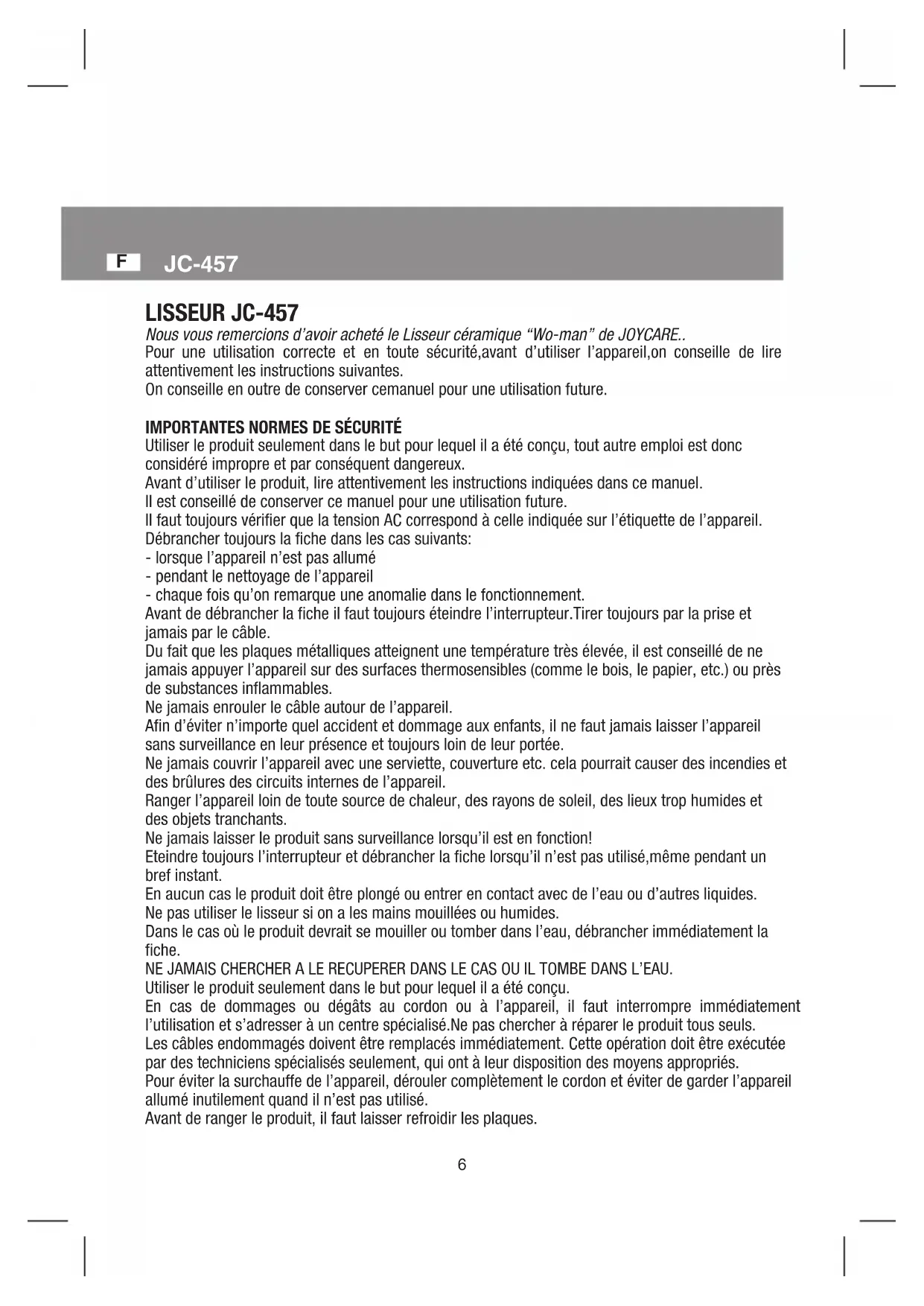 JC-457 LISSEUR JC-457 Nous vous remercions d’avoir acheté le Lisseur céramique “Wo-man” de JOYCARE.. Pour une utilisation correcte et en toute sécurité,avant d’utiliser l’appareil,on conseille de lire attentivement les instructions suivantes. On conseille en outre de conserver cemanuel pour une utilisation future.