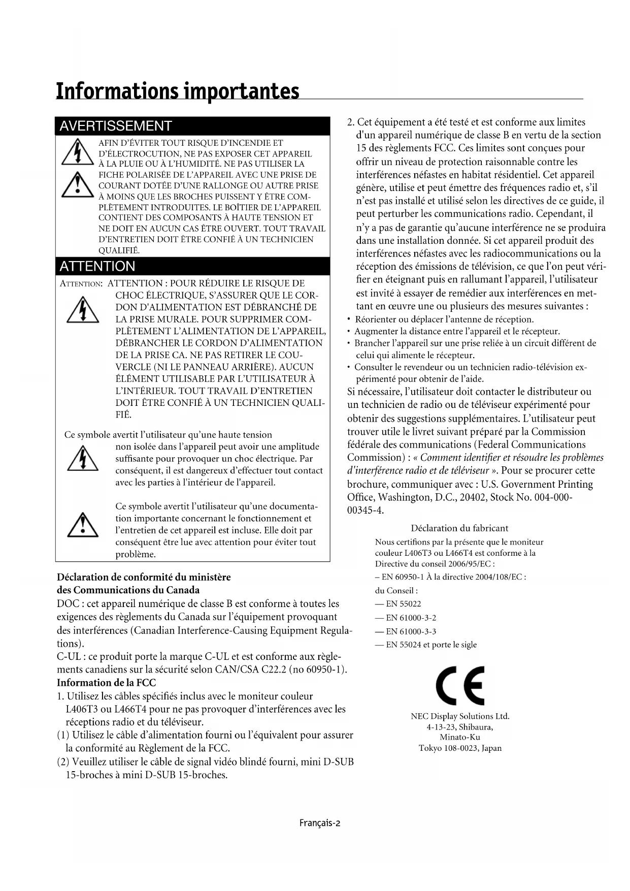 L406T3 ou L466T4 pour ne pas provoquer d’interférences avec les réceptions radio et du téléviseur. (1) Utilisez le câble d’alimentation fourni ou l’équivalent pour assurer la conformité au Règlement de la FCC. (2) Veuillez utiliser le câble de signal vidéo blindé fourni, mini D-SUB 15-broches à mini D-SUB 15-broches. Déclaration du fabricant Nous certifions par la présente que le moniteur couleur L406T3 ou L466T4 est conforme à la Directive du conseil 2006/95/EC : – EN 60950-1 À la directive 2004/108/EC : du Conseil : — EN 55022 — EN 61000-3-2 — EN 61000-3-3 — EN 55024 et porte le sigle NEC Display Solutions Ltd. 4-13-23, Shibaura, Minato-Ku Tokyo 108-0023, JapanFrançais-3 Français Consignes de sécurité et d’entretien