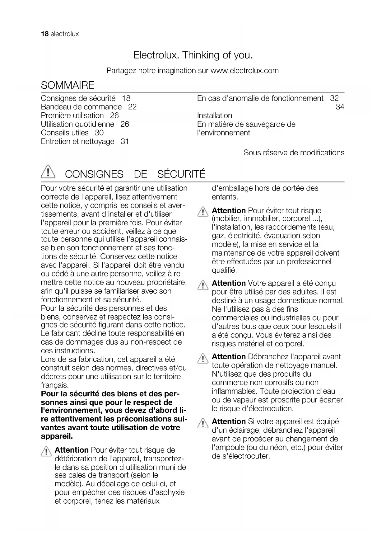 Pour votre sécurité et garantir une utilisation correcte de l'appareil, lisez attentivement cette notice, y compris les conseils et aver- tissements, avant d'installer et d'utiliser l'appareil pour la première fois. Pour éviter toute erreur ou accident, veillez à ce que toute personne qui utilise l'appareil connais- se bien son fonctionnement et ses fonc- tions de sécurité. Conservez cette notice avec l'appareil. Si l'appareil doit être vendu ou cédé à une autre personne, veillez à re- mettre cette notice au nouveau propriétaire, afin qu'il puisse se familiariser avec son fonctionnement et sa sécurité. Pour la sécurité des personnes et des biens, conservez et respectez les consi- gnes de sécurité figurant dans cette notice. Le fabricant décline toute responsabilité en cas de dommages dus au non-respect de ces instructions. Lors de sa fabrication, cet appareil a été construit selon des normes, directives et/ou décrets pour une utilisation sur le territoire français. Pour la sécurité des biens et des per- sonnes ainsi que pour le respect de l'environnement, vous devez d'abord li- re attentivement les préconisations sui- vantes avant toute utilisation de votre appareil. Attention Pour éviter tout risque de détérioration de l'appareil, transportez- le dans sa position d'utilisation muni de ses cales de transport (selon le modèle). Au déballage de celui-ci, et pour empêcher des risques d'asphyxie et corporel, tenez les matériaux d'emballage hors de portée des enfants. Attention Pour éviter tout risque (mobilier, immobilier, corporel,...), l'installation, les raccordements (eau, gaz, électricité, évacuation selon modèle), la mise en service et la maintenance de votre appareil doivent être effectuées par un professionnel qualifié. Attention Votre appareil a été conçu pour être utilisé par des adultes. Il est destiné à un usage domestique normal. Ne l'utilisez pas à des fins commerciales ou industrielles ou pour d'autres buts que ceux pour lesquels il a été conçu. Vous éviterez ainsi des risques matériel et corporel. Attention Débranchez l'appareil avant toute opération de nettoyage manuel. N'utilisez que des produits du commerce non corrosifs ou non inflammables. Toute projection d'eau ou de vapeur est proscrite pour écarter le risque d'électrocution. Attention Si votre appareil est équipé d'un éclairage, débranchez l'appareil avant de procéder au changement de l'ampoule (ou du néon, etc.) pour éviter de s'électrocuter. 18 electroluxAttention Afin d'empêcher des risques d'explosion ou d'incendie, ne placez pas de produits inflammables ou d'éléments imbibés de produits inflammables à l'intérieur, à proximité ou sur l'appareil. Attention Lors de la mise au rebut de votre appareil, et pour écarter tout risque corporel, mettez hors d'usage ce qui pourrait présenter un danger : coupez le câble d'alimentation au ras de l'appareil. Informez-vous auprès des services de votre commune des endroits autorisés pour la mise au rebut de l'appareil. Attention Respectez la chaîne de froid dès l'acquisition d'un aliment jusqu'à sa consommation pour exclure le risque d'intoxication alimentaire. Veuillez maintenant lire attentive- ment cette notice pour une utilisa- tion optimale de votre appareil. Sécurité des enfants et des personnes vulnérables