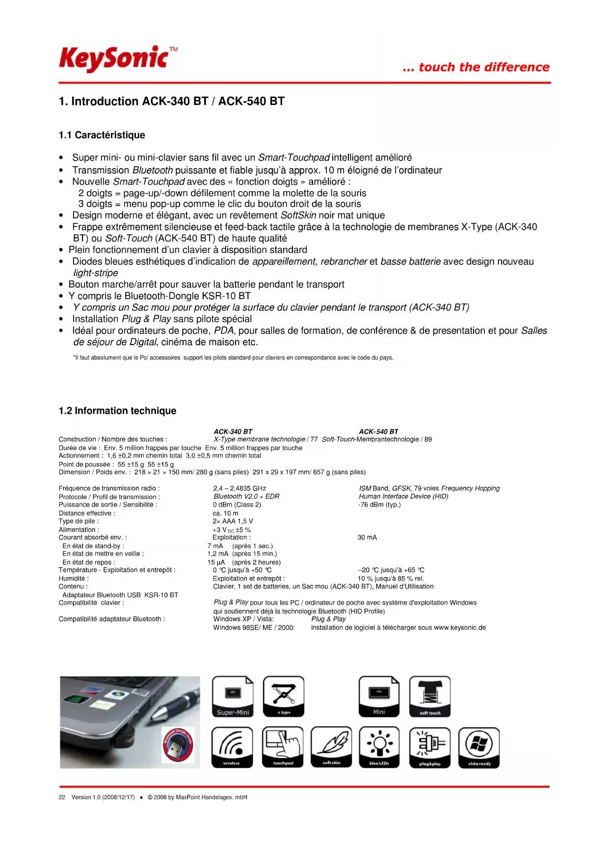 Compatibilité adaptateur Bluetooth : Windows XP / Vista: Plug & Play Windows 98SE/ ME / 2000: Installation de logiciel à télécharger sous www.keysonic.deManuel d’Utilisation ACK-340 BT & 540 BT