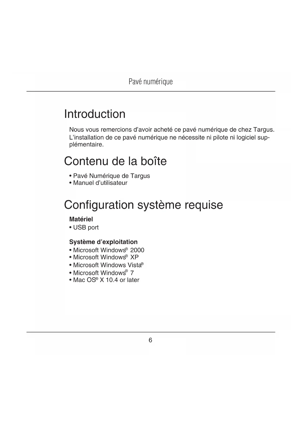 Introduction Nous vous remercions d’avoir acheté ce pavé numérique de chez Targus. L’installation de ce pavé numérique ne nécessite ni pilote ni logiciel sup- plémentaire. Contenu de la boîte