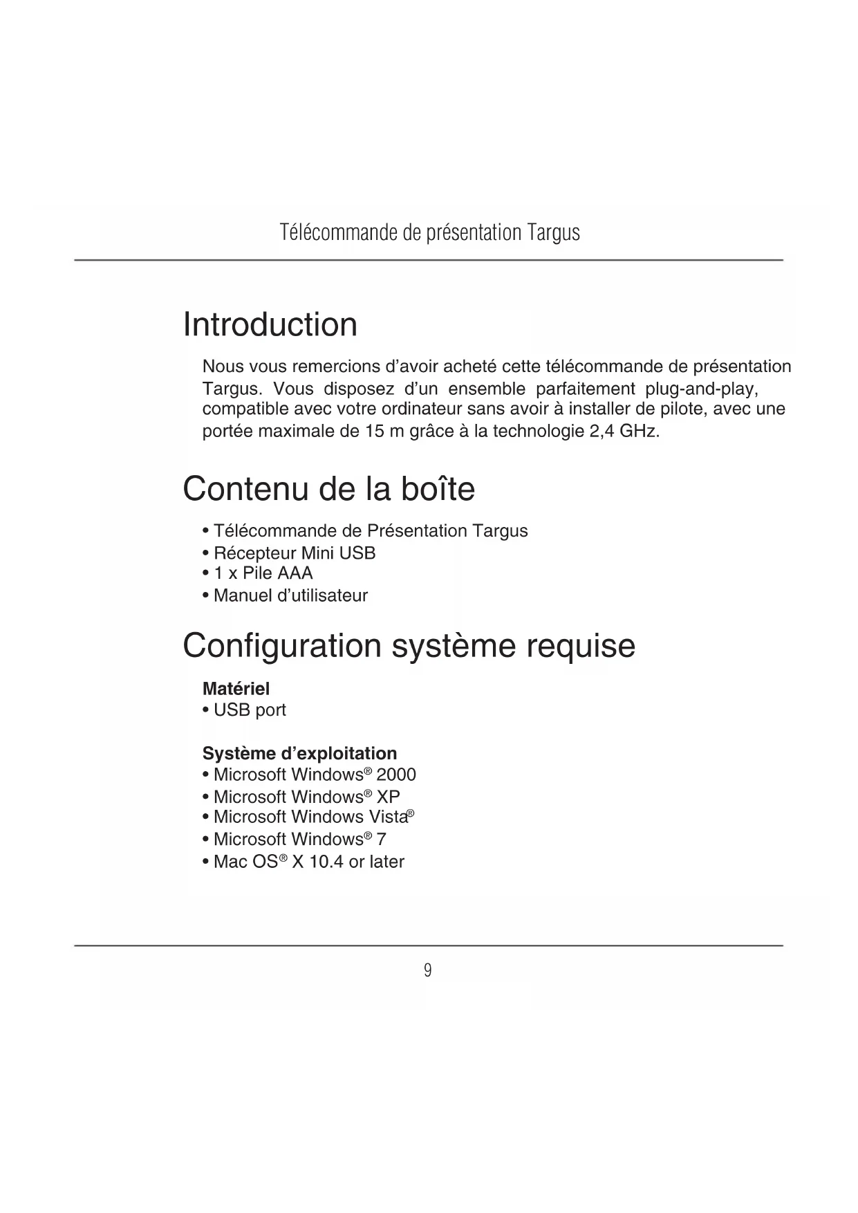 Introduction Nous vous remercions d’avoir acheté cette télécommande de présentation Targus. Vous disposez d’un ensemble parfaitement plug-and-play, compatible avec votre ordinateur sans avoir à installer de pilote, avec une portée maximale de 15 m grâce à la technologie 2,4 GHz. Configuration système requise Matériel