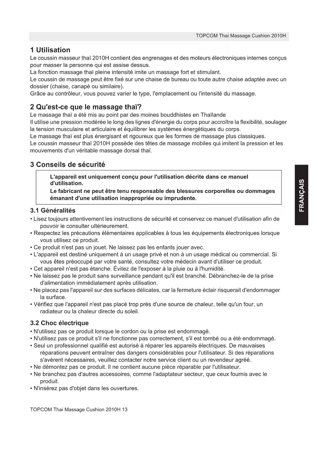 Schade of defecten als gevolg van een onjuiste behandeling of onjuist gebruik en schade als gevolg van het gebruik van niet-originele onderdelen of accessoires die niet worden aanbevolen door Topcom, vallen buiten de garantie. De garantie dekt geen schade die te wijten is aan externe factoren, zoals bliksem, water en brand, noch enige transportschade. Er kan geen aanspraak worden gemaakt op de garantie als het serienummer op het toestel gewijzigd, verwijderd of onleesbaar gemaakt is. Dit product voldoet aan de basiseisen en andere relevante bepalingen van richtlijn 2004/108/EG. De verklaring van overeenstemming vindt u op: http://www.topcom.net/cedeclarations.php HL_TMC-2010H D164.book Page 12 Friday, May 29, 2009 9:30 AMTOPCOM Thai Massage Cushion 2010H 13 TOPCOM Thai Massage Cushion 2010H FRANÇAIS 1 Utilisation Le coussin masseur thaï 2010H contient des engrenages et des moteurs électroniques internes conçus pour masser la personne qui est assise dessus. La fonction massage thaï pleine intensité imite un massage fort et stimulant. Le coussin de massage peut être fixé sur une chaise de bureau ou toute autre chaise adaptée avec un dossier (chaise, canapé ou similaire). Grâce au contrôleur, vous pouvez varier le type, l'emplacement ou l'intensité du massage. 2 Qu'est-ce que le massage thaï? Le massage thaï a été mis au point par des moines bouddhistes en Thaïlande Il utilise une pression modérée le long des lignes d'énergie du corps pour accroître la flexibilité, soulager la tension musculaire et articulaire et équilibrer les systèmes énergétiques du corps. Le massage thaï est plus énergisant et rigoureux que les formes de massage plus classiques. Le coussin masseur thaï 2010H possède des têtes de massage mobiles qui imitent la pression et les mouvements d'un véritable massage dorsal thaï. 3 Conseils de sécurité