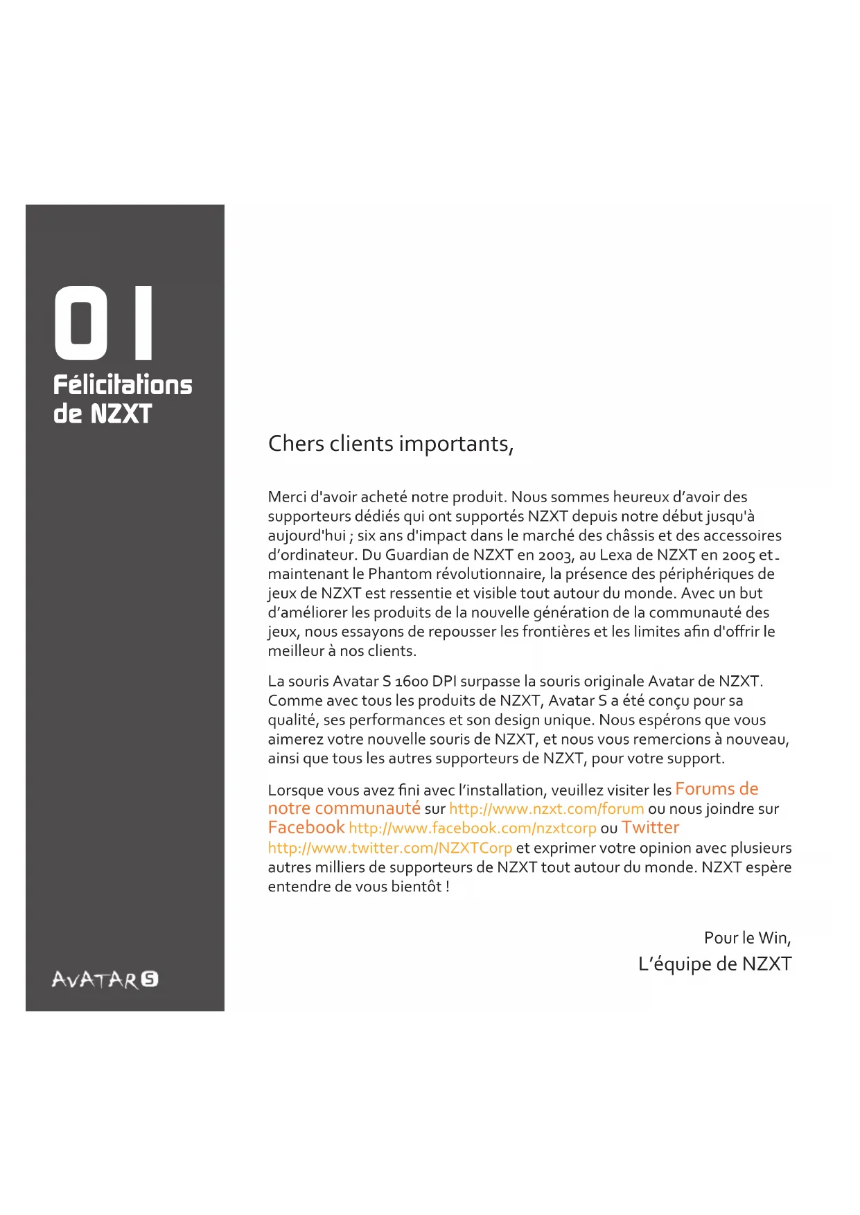 Pour le Win, L’équipe de NZXT Félicitations de NZXT Merci d'avoir acheté notre produit. Nous sommes heureux d’avoir des supporteurs dédiés qui ont supportés NZXT depuis notre début jusqu'à aujourd'hui ; six ans d'impact dans le marché des châssis et des accessoires d’ordinateur. Du Guardian de NZXT en 2003, au Lexa de NZXT en 2005 et maintenant le Phantom révolutionnaire, la présence des périphériques de jeux de NZXT est ressentie et visible tout autour du monde. Avec un but d’améliorer les produits de la nouvelle génération de la communauté des jeux, nous essayons de repousser les frontières et les limites afin d'offrir le meilleur à nos clients.La souris Avatar S 1600 DPI surpasse la souris originale Avatar de NZXT. Comme avec tous les produits de NZXT, Avatar S a été conçu pour sa qualité, ses performances et son design unique. Nous espérons que vous aimerez votre nouvelle souris de NZXT, et nous vous remercions à nouveau, ainsi que tous les autres supporteurs de NZXT, pour votre support.Lorsque vous avez fini avec l’installation, veuillez visiter les Forums de notre communauté sur http://www.nzxt.com/forum ou nous joindre sur Facebook http://www.facebook.com/nzxtcorp ou Twitter http://www.twitter.com/NZXTCorp et exprimer votre opinion avec plusieurs autres milliers de supporteurs de NZXT tout autour du monde. NZXT espère entendre de vous bientôt !02 Contenu de la boîte