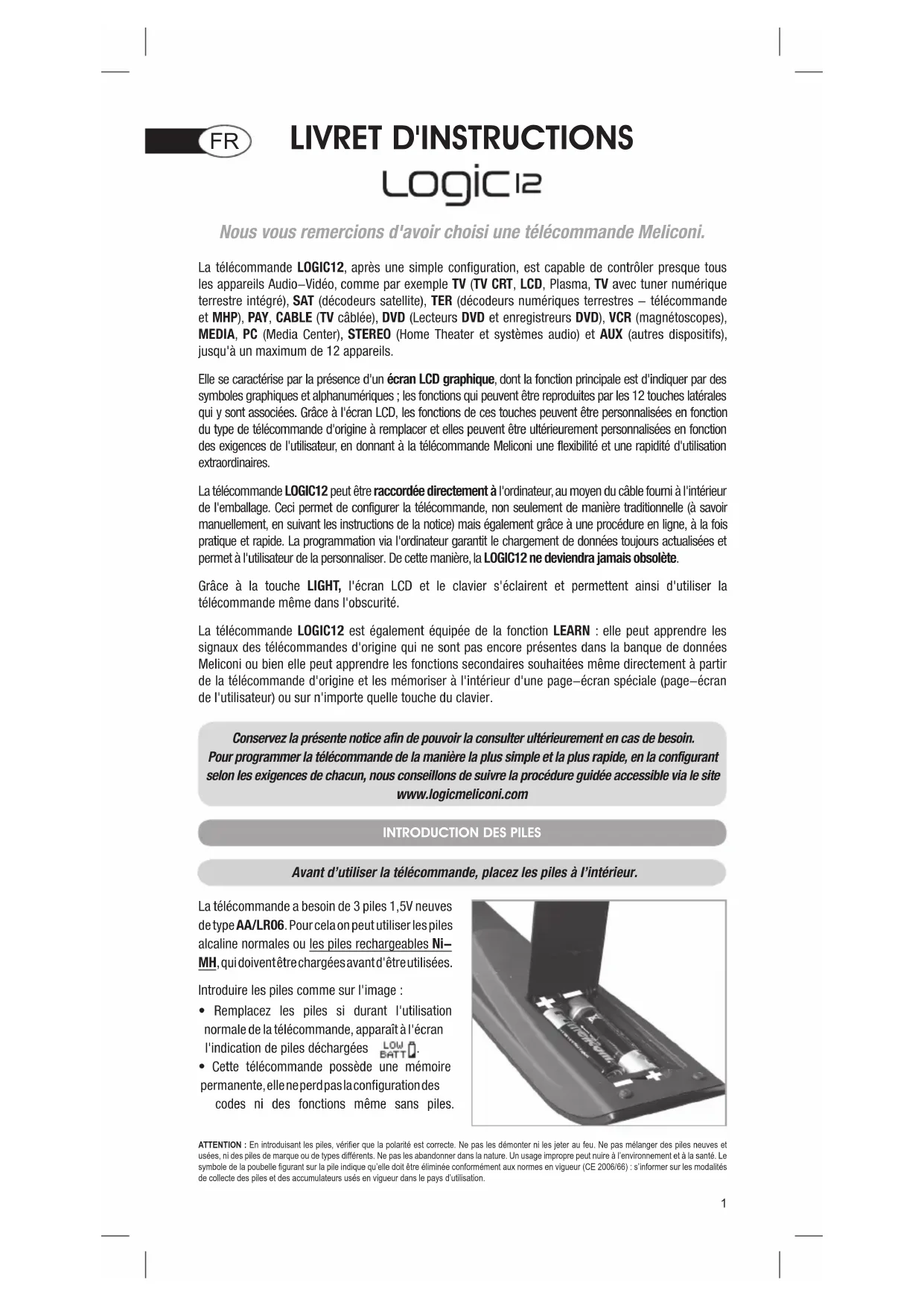 LIVRET D'INSTRUCTIONS Nous vous remercions d'avoir choisi une télécommande Meliconi. La télécommande LOGIC12, après une simple configuration, est capable de contrôler presque tous les appareils Audio-Vidéo, comme par exemple TV (TV CRT, LCD, Plasma, TV avec tuner numérique terrestre intégré), SAT (décodeurs satellite), TER (décodeurs numériques terrestres - télécommande et MHP), PAY, CABLE (TV câblée), DVD (Lecteurs DVD et enregistreurs DVD), VCR (magnétoscopes), MEDIA, PC (Media Center), STEREO (Home Theater et systèmes audio) et AUX (autres dispositifs), jusqu'à un maximum de 12 appareils. Elle se caractérise par la présence d'un écran LCD graphique, dont la fonction principale est d'indiquer par des symboles graphiques et alphanumériques ; les fonctions qui peuvent être reproduites par les 12 touches latérales qui y sont associées. Grâce à l'écran LCD, les fonctions de ces touches peuvent être personnalisées en fonction du type de télécommande d'origine à remplacer et elles peuvent être ultérieurement personnalisées en fonction des exigences de l'utilisateur, en donnant à la télécommande Meliconi une flexibilité et une rapidité d'utilisation extraordinaires. La télécommande LOGIC12 peut être raccordée directement à l'ordinateur, au moyen du câble fourni à l'intérieur de l'emballage. Ceci permet de configurer la télécommande, non seulement de manière traditionnelle (à savoir manuellement, en suivant les instructions de la notice) mais également grâce à une procédure en ligne, à la fois pratique et rapide. La programmation via l'ordinateur garantit le chargement de données toujours actualisées et permet à l'utilisateur de la personnaliser. De cette manière, la LOGIC12 ne deviendra jamais obsolète. Grâce à la touche LIGHT, l'écran LCD et le clavier s'éclairent et permettent ainsi d'utiliser la télécommande même dans l'obscurité. La télécommande LOGIC12 est également équipée de la fonction LEARN : elle peut apprendre les signaux des télécommandes d'origine qui ne sont pas encore présentes dans la banque de données Meliconi ou bien elle peut apprendre les fonctions secondaires souhaitées même directement à partir de la télécommande d'origine et les mémoriser à l'intérieur d'une page-écran spéciale (page-écran de l'utilisateur) ou sur n'importe quelle touche du clavier. Conservez la présente notice afin de pouvoir la consulter ultérieurement en cas de besoin. Pour programmer la télécommande de la manière la plus simple et la plus rapide, en la configurant selon les exigences de chacun, nous conseillons de suivre la procédure guidée accessible via le site www.logicmeliconi.com