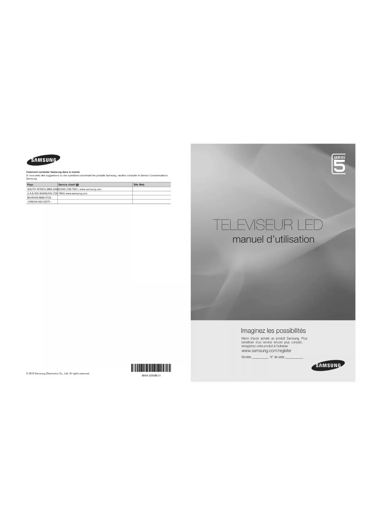 Modèle ___________ N° de série ____________ Comment contacter Samsung dans le monde Si vous avez des suggestions ou des questions concernant les produits Samsung, veuillez contacter le Service Consommateurs Samsung. Pays Service client Site WebSOUTH AFRICA 0860-SAMSUNG (726-7864 ) www.samsung.comU.A.E 800-SAMSUNG (726-7864) www.samsung.comBAHRAIN 8000-4726 -JORDAN 800-22273 - 0_BN68-02838B-01Fre-Cover.indd 1 2010-03-18 오전 10:59:23Français