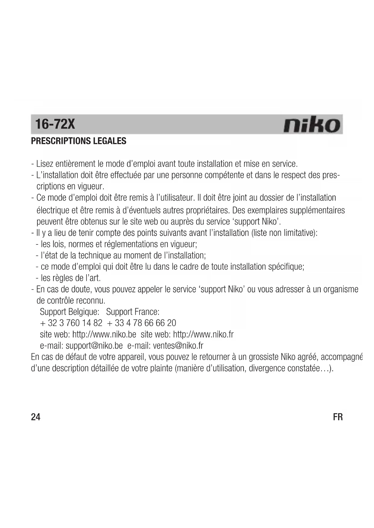 Ce mode d'emploi doit être remis à l'utilisateur. Il doit être joint au dossier de l'installation électrique et être remis à d'éventuels autres propriétaires. Des exemplaires supplémentaires peuvent être obtenus sur le site web ou auprès du service 'support Niko'.
