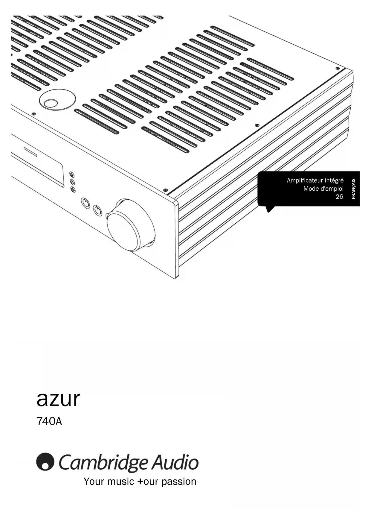 Your music + our passion 740A azur FRANÇAIS Amplificateur intégré Mode d'emploi 26Nous vous remercions d'avoir choisi cet amplificateur intégré Azur 740A. Nous vous souhaitons de nombreuses années de plaisir d'écoute. Le 740A est basé sur la topologie primée des modèles d'amplificateur 540A et 640A, mais ce nouveau modèle haut de gamme bénéficie des derniers développements et des dernières améliorations de notre programme de développement en cours. Le 740A intègre trois circuits secondaires de transformation distincts pour les canaux gauche et droit de l'amplificateur de puissance et du préamplificateur, avec des redresseurs et des alimentations séparés pour un fonctionnement en double mono des amplificateurs de puissance gauche et droit. Deux paires de transistors de sortie très haute tension par canal permettent de brancher au 740A presque toutes les enceintes, et garantissent une excellente réponse des basses et un contrôle dynamique. L'appareil offre en outre une commande de volume/de balance à cadre en silicone très haute précision à la place du potentiomètre plus communément utilisé. La commande du volume s'effectue par palier de 1 dB sur la plus grande partie de la plage de réglage, pour un contrôle très fin, un principe logarithmique précis et une balance des canaux d'une grande précision. Le contrôle par logiciel de toutes les commandes permet une application de l'équilibrage de gain à toutes les entrées et autres fonctions. Le 740A inclut également la prise en charge d'une utilisation multipièces. En branchant un ou deux claviers externes Incognito de Cambridge Audio (ou enceintes actives) et une unité d'alimentation, votre amplificateur peut devenir le centre nerveux d'un système multipièces simple. En outre, l'appareil est muni d'une entrée-sortie de bus de commande et d'une entrée d'émetteur infrarouge, pour faciliter son intégration éventuelle dans des systèmes personnalisés. Une télécommande Azur Navigator est également fournie, pour permettre une commande à distance complète des fonctions de l'amplificateur sous une forme attrayante et simple d'emploi. Votre amplificateur ne peut faire preuve de ses qualités qu'en étant raccordé à un système de qualité équivalente. Les caractéristiques de votre appareil ne doivent pas être bridées par l'utilisation de sources, d'enceintes ou de câbles qui ne seraient pas à la hauteur. Bien entendu, nous recommandons en particulier les appareils de la gamme Cambridge Audio Azur, conçus dans le même esprit d'excellence que cet amplificateur. Votre revendeur peut également vous proposer des câbles d'interconnexion Cambridge Audio d'excellente qualité, qui vous permettront de tirer le meilleur de votre chaîne. Nous vous recommandons de prendre le temps de lire ce mode d'emploi et de le conserver dans un endroit sûr afin de pouvoir vous y référer ultérieurement. Matthew Bramble Directeur technique