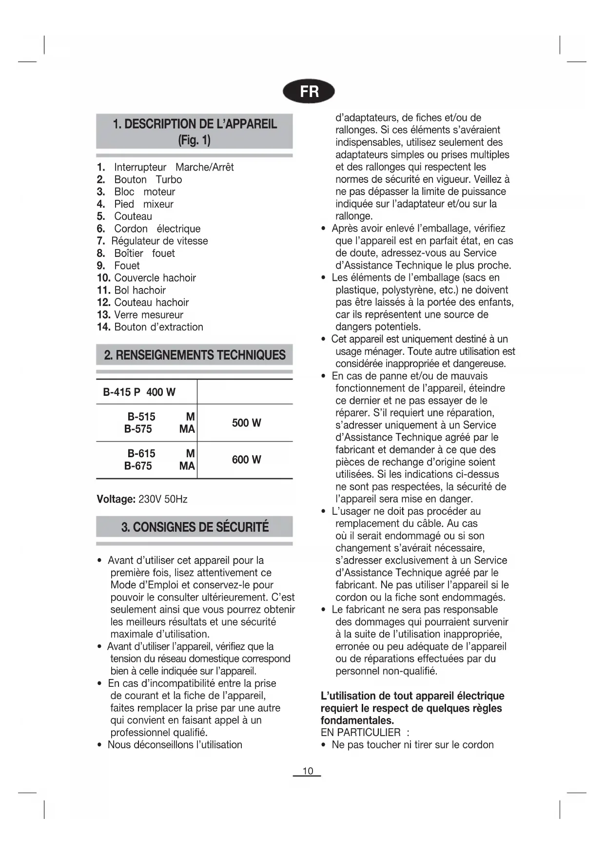mixeur, en l'alignant sur les repères de positionnement, jusqu’à entendre un clic (fig. 6). Introduire le mixeur dans le récipient, brancher l’appareil et presser le bouton de marche/arrêt pour commencer à battre. Utiliser le régulateur de vitesse pour choisir une vitesse (B-615M, B-675 MA) ou presser le bouton de la fonction turbo. Utiliser le bol (13) ou un autre récipient pour battre. Fonction hachoir (mod. B-575 MA, B-675 MA) Utiliser le hachoir pour les fruits secs, les herbes, les œufs durs, le pain sec, etc. Placer la lame du hachoir (12) dans l’axe du bol (fig. 3). Placer les ingrédients à hacher dans le bol. Placer le couvercle du hachoir (10) sur le bol en veillant à bien l’aligner avec la lame. Insérer à pression, en suivant les repères de positionnement, le corps du moteur (3) sur le couvercle du hachoir (3) jusqu’à entendre un clic. (Fig. 4). Brancher l’appareil sur le secteur et presser le bouton de marche/arrêt. Utiliser le régulateur de vitesse (7) pour choisir une vitesse (uniquement modèles B-615M, B-675 MA) ou presser le bouton de la fonction turbo (2) pour hacher plus rapidement. Une fois le hachage terminé, veiller à retirer la lame du bol avant de retirer l’aliment. Nettoyage et entretien Débranchez l’appareil du secteur avant de procéder à une quelconque opération de nettoyage ou d’entretien. Nettoyez tous les accessoires immédiatement après chaque utilisation, afin de prolonger leur vie utile. Manipulez avec précaution les couteaux car ils sont très tranchants. Maintenez les enfants éloignés des couteaux de l’appareil. Le bol et le verre mesureur (11 et 13), ainsi que le fouet (9) peuvent être lavés en lave-vaisselle. Ne pas introduire le reste des composants dans le lave-vaisselle. Pour nettoyer toutes les pièces de l’extérieur, utiliser une éponge humide.