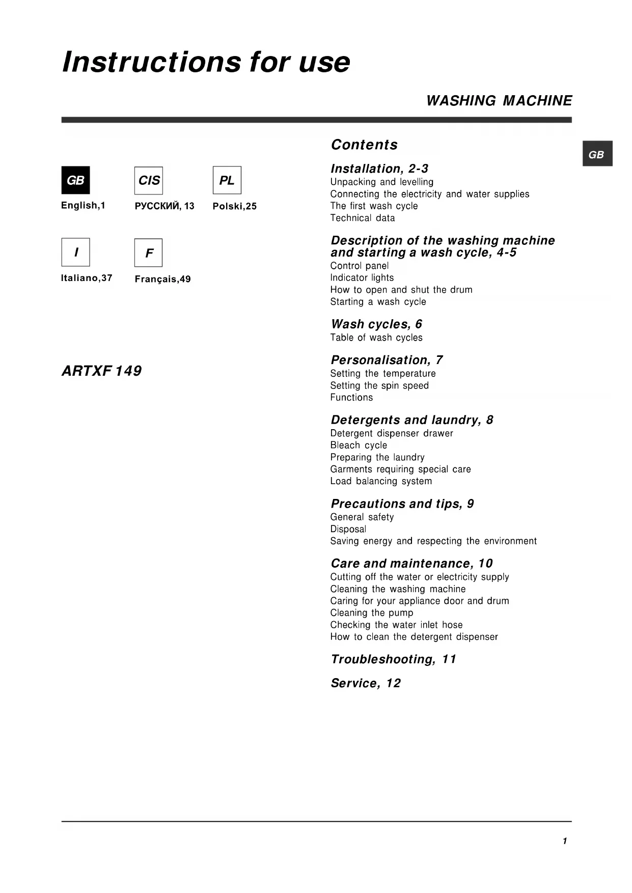 ARTXF 149 (EU) - Machine à laver HOTPOINT - Notice d'utilisation et mode d'emploi gratuit