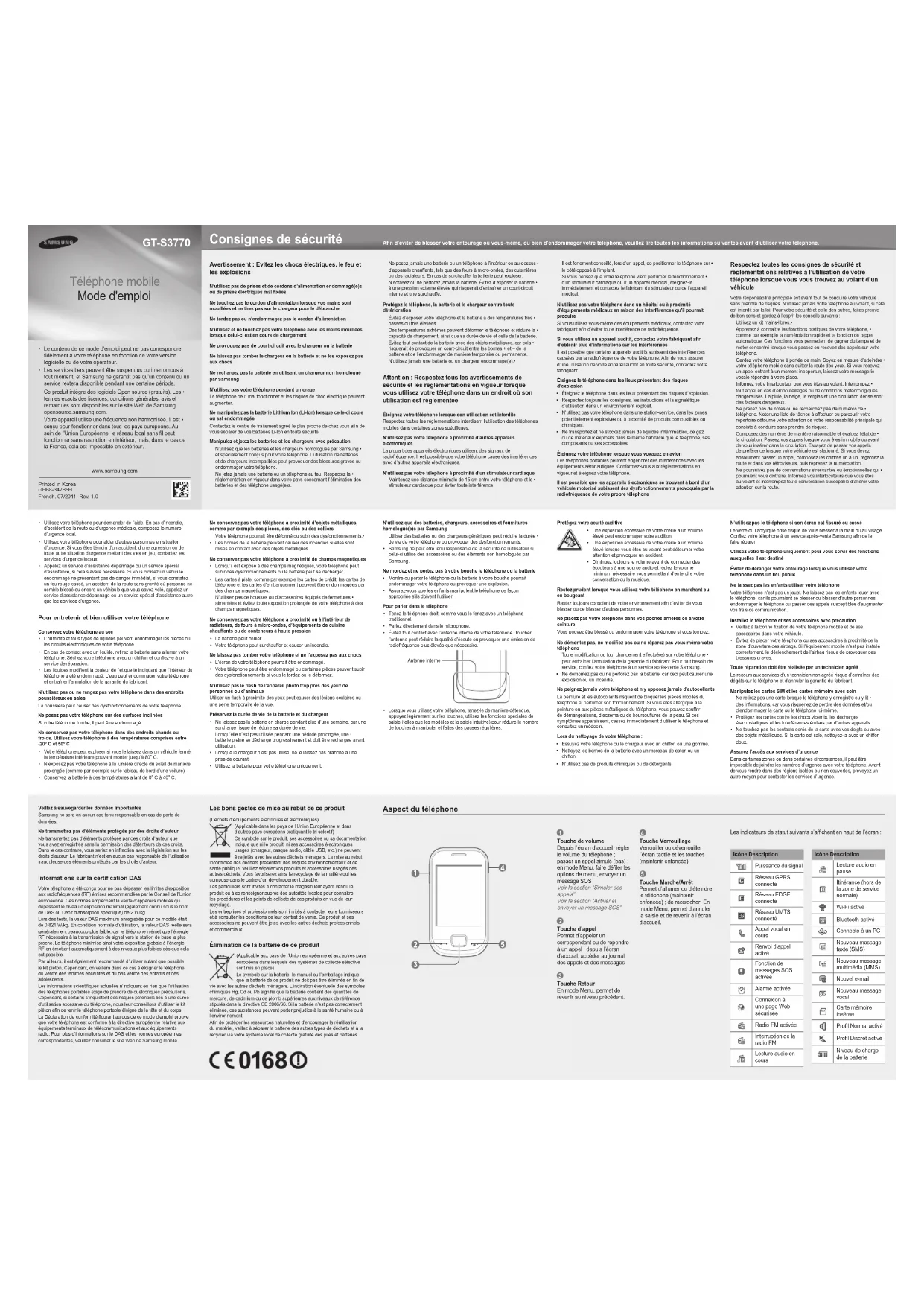 GH68-34785H French. 07/2011. Rev. 1.0 Le contenu de ce mode d'emploi peut ne pas correspondre • dèlement à votre téléphone en fonction de votre version logicielle ou de votre opérateur.Les services tiers peuvent être suspendus ou interrompus à • tout moment, et Samsung ne garantit pas qu'un contenu ou un service restera disponible pendant une certaine période.Ce produit intègre des logiciels Open source (gratuits). Les • termes exacts des licences, conditions générales, avis et remarques sont disponibles sur le site Web de Samsung opensource.samsung.com.Votre appareil utilise une fréquence non harmonisée. Il est • conçu pour fonctionner dans tous les pays européens. Au sein de l'Union Européenne, le réseau local sans l peut fonctionner sans restriction en intérieur, mais, dans le cas de la France, cela est impossible en extérieur. GT-S3770