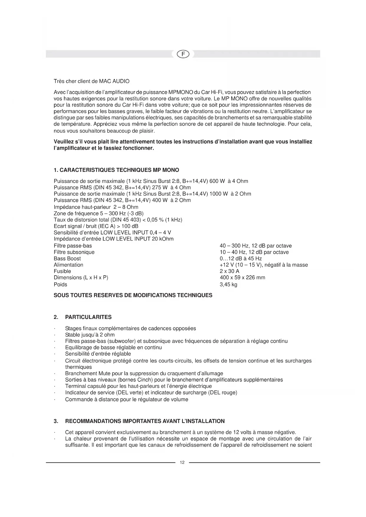Très cher client de MAC AUDIO Avec l’acquisition de l’amplificateur de puissance MPMONO du Car Hi-Fi, vous pouvez satisfaire à la perfection vos hautes exigences pour la restitution sonore dans votre voiture. Le MP MONO offre de nouvelles qualités pour la restitution sonore du Car Hi-Fi dans votre voiture; que ce soit pour les impressionnantes réserves de performances pour les basses graves, le faible facteur de vibrations ou la restitution neutre. L’amplificateur se distingue par ses faibles manipulations électriques, ses capacités de branchements et sa remarquable stabilité de température. Appréciez vous même la perfection sonore de cet appareil de haute technologie. Pour cela, nous vous souhaitons beaucoup de plaisir. Veuillez s’il vous plait lire attentivement toutes les instructions d’installation avant que vous installiez l’amplificateur et le fassiez fonctionner.