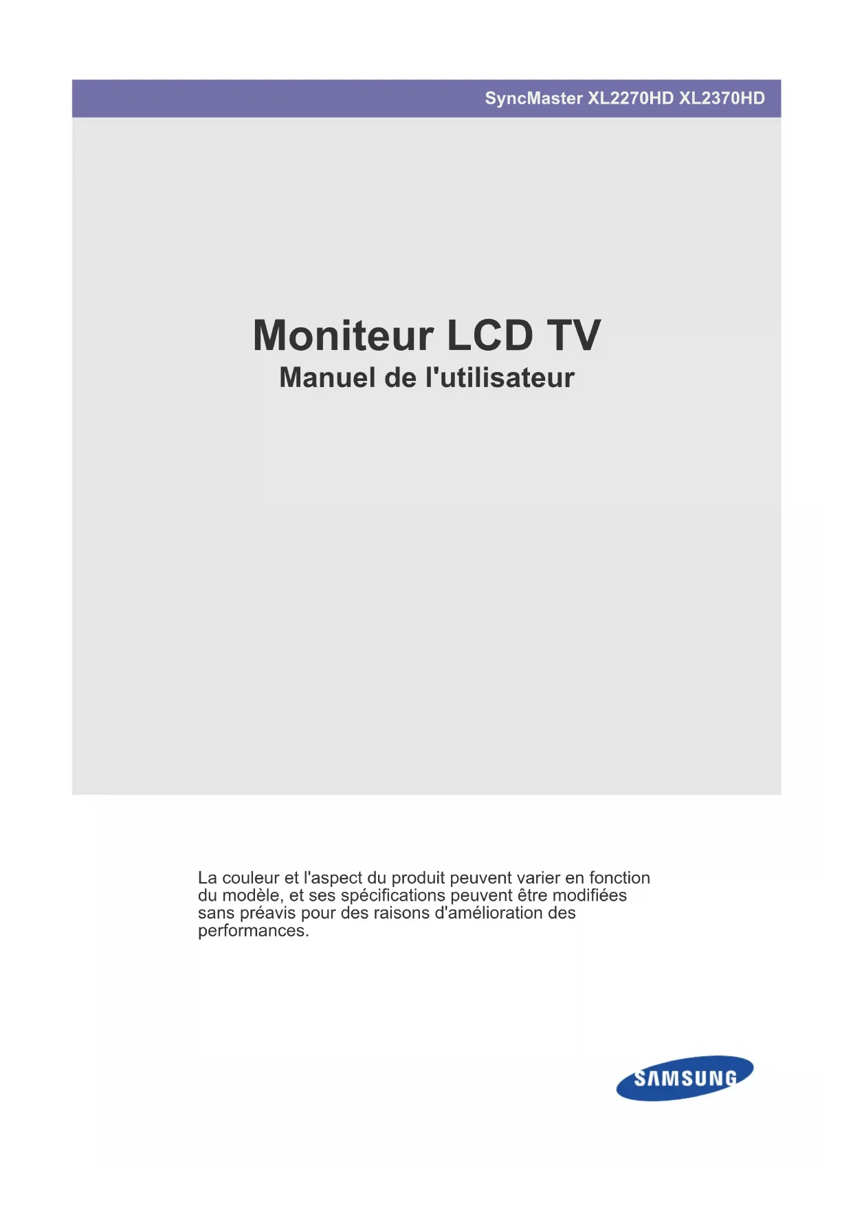 SyncMaster XL2270HD XL2370HD Moniteur LCD TV Manuel de l'utilisateur La couleur et l'aspect du produit peuvent varier en fonction du modèle, et ses spécifications peuvent être modifiées sans préavis pour des raisons d'amélioration des performances.Table des matières