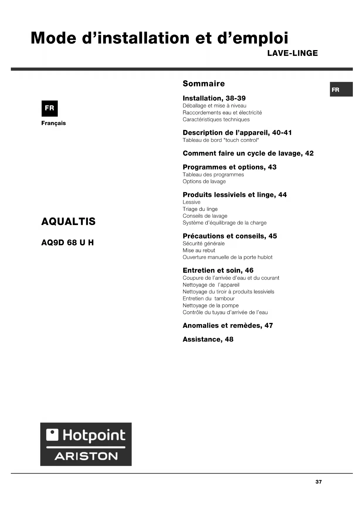 AQ9D 68 U H - Machine à laver HOTPOINT ARISTON - Notice d'utilisation et mode d'emploi gratuit