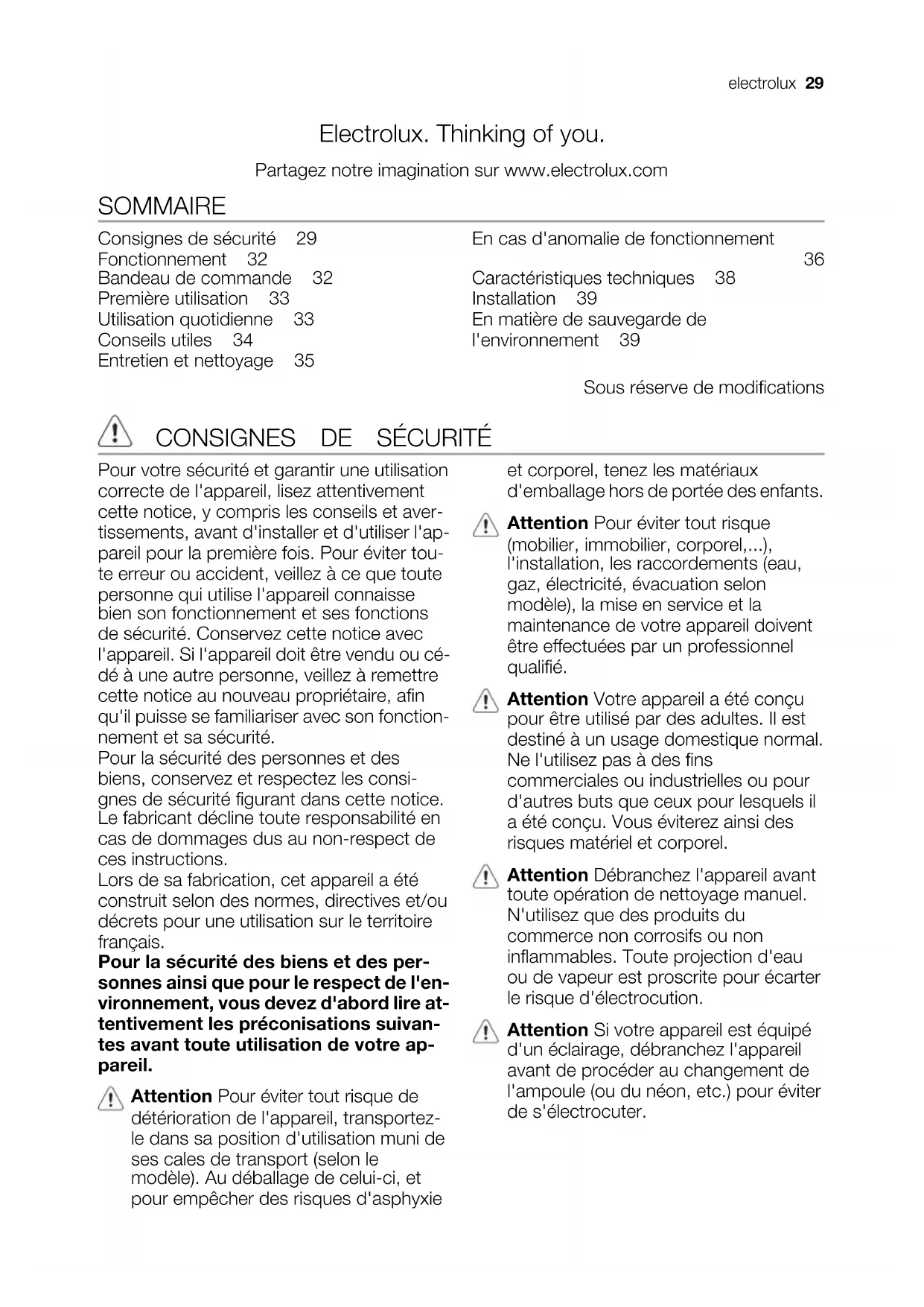Pour votre sécurité et garantir une utilisation correcte de l'appareil, lisez attentivement cette notice, y compris les conseils et aver- tissements, avant d'installer et d'utiliser l'ap- pareil pour la première fois. Pour éviter tou- te erreur ou accident, veillez à ce que toute personne qui utilise l'appareil connaisse bien son fonctionnement et ses fonctions de sécurité. Conservez cette notice avec l'appareil. Si l'appareil doit être vendu ou cé- dé à une autre personne, veillez à remettre cette notice au nouveau propriétaire, afin qu'il puisse se familiariser avec son fonction- nement et sa sécurité. Pour la sécurité des personnes et des biens, conservez et respectez les consi- gnes de sécurité figurant dans cette notice. Le fabricant décline toute responsabilité en cas de dommages dus au non-respect de ces instructions. Lors de sa fabrication, cet appareil a été construit selon des normes, directives et/ou décrets pour une utilisation sur le territoire français. Pour la sécurité des biens et des per- sonnes ainsi que pour le respect de l'en- vironnement, vous devez d'abord lire at- tentivement les préconisations suivan- tes avant toute utilisation de votre ap- pareil. Attention Pour éviter tout risque de détérioration de l'appareil, transportez- le dans sa position d'utilisation muni de ses cales de transport (selon le modèle). Au déballage de celui-ci, et pour empêcher des risques d'asphyxie et corporel, tenez les matériaux d'emballage hors de portée des enfants. Attention Pour éviter tout risque (mobilier, immobilier, corporel,...), l'installation, les raccordements (eau, gaz, électricité, évacuation selon modèle), la mise en service et la maintenance de votre appareil doivent être effectuées par un professionnel qualifié. Attention Votre appareil a été conçu pour être utilisé par des adultes. Il est destiné à un usage domestique normal. Ne l'utilisez pas à des fins commerciales ou industrielles ou pour d'autres buts que ceux pour lesquels il a été conçu. Vous éviterez ainsi des risques matériel et corporel. Attention Débranchez l'appareil avant toute opération de nettoyage manuel. N'utilisez que des produits du commerce non corrosifs ou non inflammables. Toute projection d'eau ou de vapeur est proscrite pour écarter le risque d'électrocution. Attention Si votre appareil est équipé d'un éclairage, débranchez l'appareil avant de procéder au changement de l'ampoule (ou du néon, etc.) pour éviter de s'électrocuter. electrolux 29Attention Afin d'empêcher des risques d'explosion ou d'incendie, ne placez pas de produits inflammables ou d'éléments imbibés de produits inflammables à l'intérieur, à proximité ou sur l'appareil. Attention Lors de la mise au rebut de votre appareil, et pour écarter tout risque corporel, mettez hors d'usage ce qui pourrait présenter un danger : coupez le câble d'alimentation au ras de l'appareil. Informez-vous auprès des services de votre commune des endroits autorisés pour la mise au rebut de l'appareil. Attention Respectez la chaîne de froid dès l'acquisition d'un aliment jusqu'à sa consommation pour exclure le risque d'intoxication alimentaire. Veuillez maintenant lire attentive- ment cette notice pour une utilisa- tion optimale de votre appareil. Sécurité des enfants et des personnes vulnérables