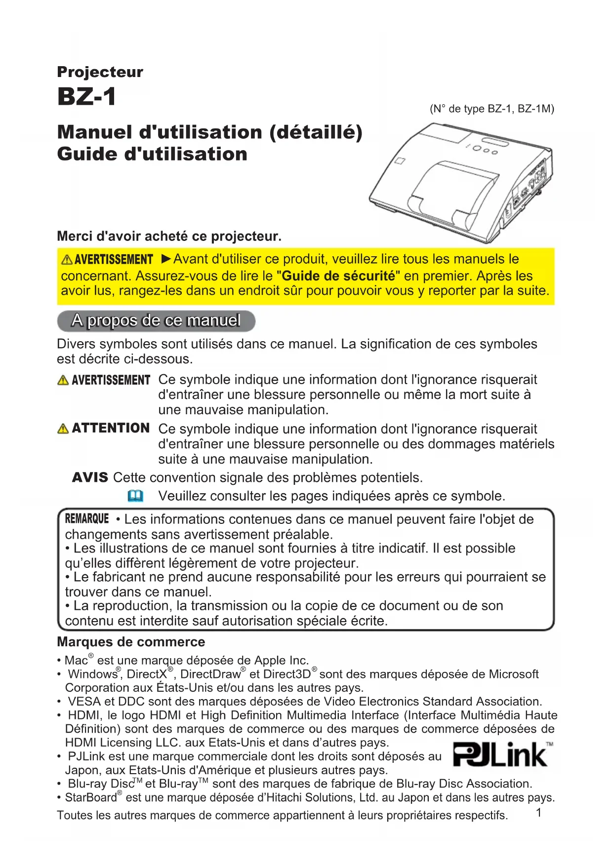 - Mac est une marque déposée de Apple Inc.• Windows , DirectX , DirectDraw et Direct3D sont des marques déposée de Microsoft Corporation aux États-Unis et/ou dans les autres pays.• VESA et DDC sont des marques déposées de Video Electronics Standard Association.• HDMI, le logo HDMI et High Definition Multimedia Interface (Interface Multimédia Haute Définition) sont des marques de commerce ou des marques de commerce déposées de HDMI Licensing LLC. aux Etats-Unis et dans d’autres pays.• PJLink est une marque commerciale dont les droits sont déposés au Japon, aux Etats-Unis d'Amérique et plusieurs autres pays.• Blu-ray Disc et Blu-ray sont des marques de fabrique de Blu-ray Disc Association. StarBoard est une marque déposée d’Hitachi Solutions, Ltd. au Japon et dans les autres pays.Toutes les autres marques de commerce appartiennent à leurs propriétaires respectifs. Divers symboles sont utilisés dans ce manuel. La signification de ces symboles est décrite ci-dessous. A propos de ce manuel AVERTISSEMENT ATTENTION Ce symbole indique une information dont l'ignorance risquerait d'entraîner une blessure personnelle ou même la mort suite à une mauvaise manipulation. Ce symbole indique une information dont l'ignorance risquerait d'entraîner une blessure personnelle ou des dommages matériels suite à une mauvaise manipulation. Veuillez consulter les pages indiquées après ce symbole.