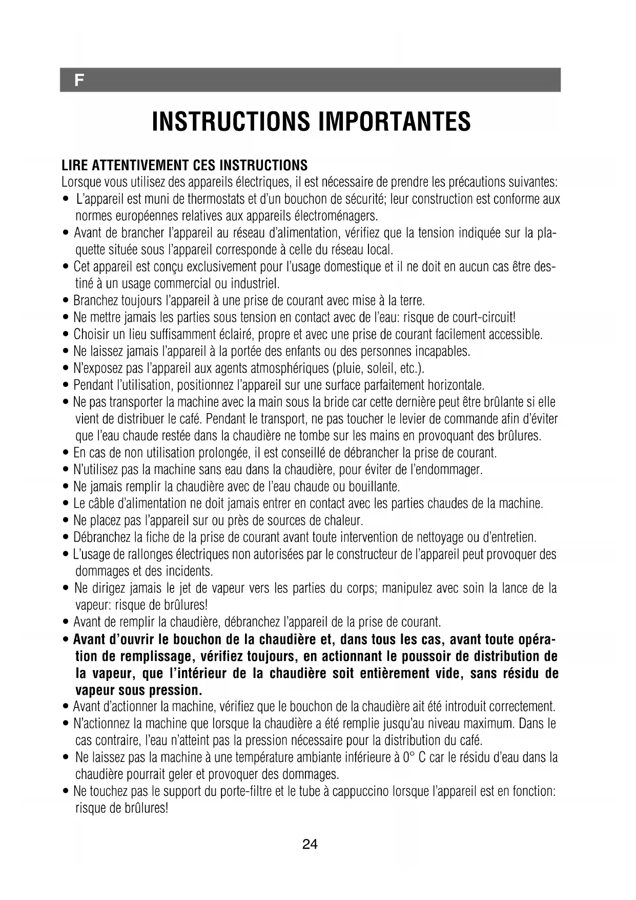 - Ne pas toucher les parties métalliques externes de l'appareil et du porte-filtre lorsque la machine est en fonction, pour éviter les risques de brûlures.