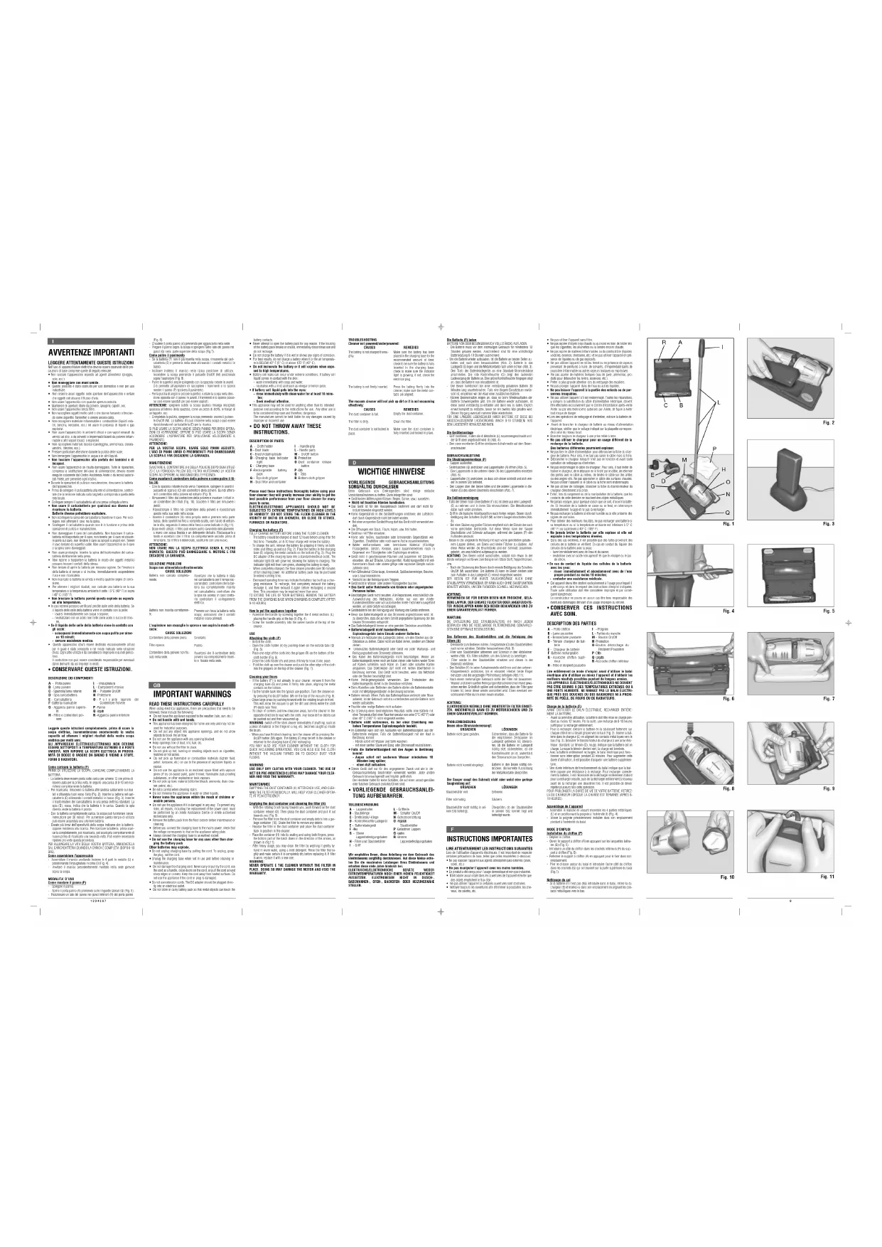 DESCRIPTION DES PARTIES Lire entièrement ce mode d’emploi avant d’utiliser le balaiélectrique afin d’utiliser au mieux l’appareil et d’obtenir lesmeilleurs résultats possibles pendant de longues années.LES APPAREILS ÉLECTRIQUES/ÉLECTRONIQUES NE DOIVENTPAS ÊTRE SOUMIS À DES TEMPÉRATURES EXTRÊMES OU ÀUNE FORTE HUMIDITÉ. NE RANGEZ PAS LE BALAI ÉLECTRI-QUE PRÈS DES DOUCHES OU DES BAIGNOIRES NI À PROXI-MITÉ DE POÊLE, DE FOURS OU DE RADIATEURS.Charge de la batterie (F)AVANT D’UTILISER LE BALAI ÉLECTRIQUE, RECHARGER ENTIÈRE-MENT LA BATTERIE. - Avant sa première utilisation, la batterie doit être mise en charge pen-dant au moins 12 heures. Par la suite, une recharge de 8-10 heuressuffit pour la recharger entièrement.- Pour la recharger, extraire la batterie en la saisissant fortement surchaque côté et en la faisant glisser vers le haut (Fig. 2). Insérer la bat-terie dans le chargeur (E) en alignant les contacts métalliques vers lebas (Fig. 3). Brancher le transformateur du chargeur à une prise élec-trique standard. Le témoin (D), rouge, indique que la batterie est encharge. Lorsque le témoin devient vert, la charge est terminée.- Avec la batterie entièrement rechargée, le balai électrique peut fonc-tionner sans interruption pendant 30 minutes. Pour augmenter cettedurée d’utilisation, il est possible d’acquérir une batterie supplémen-taire.- Une durée inférieure de fonctionnement du balai indique que la bat-terie oppose une résistance à la recharge. Pour recharger correcte-ment la batterie, il est nécessaire de la décharger entièrement d’abordpour la recharger ensuite, puis de la décharger entièrement à nouveauavant de la recharger une deuxième fois. Il est possible de devoirrépéter plusieurs fois cette opération.POUR PROLONGER LA DURÉE DE VIE DE VOTRE BATTERIE, RETIREZ-LA DU CHARGEUR LORSQUE LA CHARGE EST TERMINÉE (APRÈS 8-10 HEURES).Assemblage de l’appareil- Assembler le manche en vissant ensemble les 4 parties métalliques(L) et en positionnant la poignée à l’extrémité (I) (Fig. 4).- Visser la poignée précédemment installée dans son emplacementpivotant à l’extrémité du balai.MODE D’EMPLOIInstallation du chiffon (P)- Déplier le chiffon.- Ouvrir le support à chiffon (A) en appuyant sur les languettes latéra-les (Q) (Fig. 5).- Introduire un côté du chiffon dans les crochets inférieurs (R) du sup-port à chiffon (Fig. 6).- Refermer le support à chiffon (A) en appuyant pour le fixer dans sonemplacement.- Plier le chisson autour du balai et introduire l’autre côté du chiffondans les crochets (G) qui se trouvent sur la partir supérieure du balai(Fig.7).Nettoyage du sol- Si la batterie (F) n’est pas déjà introduite dans le balai, retirez-la duchargeur (E) et insérez-la dans son emplacement en alignant les con-tacts métalliques vers le bas.A- - Porte chiffon B - Lame poussière C - Brosse/lame pivotanteD - Témoin chargeur de bat-terie E - Chargeur de batterieF - Batterie rechargeableG - Accroche chiffon supé-rieurH - Filtre et récipient poussière I - PoignéeL - Parties du manche M - Bouton On/OffN - Protection O - Bouton décrochage duRécipient PoussièreP - ChiffonQ - LanguettesR - Accroche chiffon inférieur Fig. 11- Incliner le manche en arrière, dans la position typique d’utilisation.