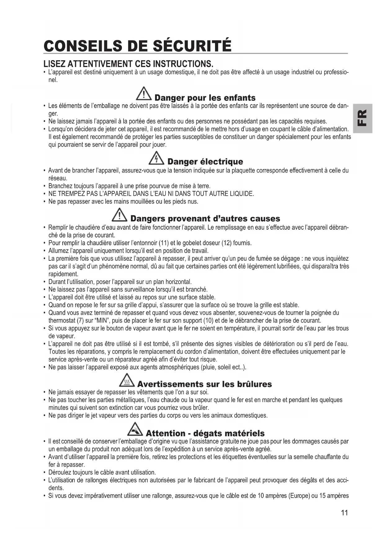 pas car il s’agit d’un phénomène normal, dû au fait que certaines parties ont été légèrement lubriées, qui disparaîtra très rapidement.• Durant l’utilisation, poser l’appareil sur un plan horizontal. • Ne laissez pas l’appareil sans surveillance lorsqu’il est branché.• L’appareil doit être utilisé et laissé au repos sur une surface stable. • Quand on repose le fer sur sa grille d’appui, s’assurer que la surface où se trouve la grille est stable. • Quand vous avez terminé de repasser et quand vous devez vous absenter, souvenez-vous de tourner la poignée du thermostat (7) sur “MIN”, puis de placer le fer sur son support (10) et de le débrancher de la prise de courant. • Si vous appuyez sur le bouton de vapeur avant que le fer ne soient en température, il pourrait sortir de l’eau par les trous de vapeur. • L’appareil ne doit pas être utilisé si il est tombé, s’il présente des signes visibles de détérioration ou s’il perd de l’eau. Toutes les réparations, y compris le remplacement du cordon d’alimentation, doivent être effectuées uniquement par le service après-vente ou un réparateur agréé an d’éviter tout risque. • Ne pas laisser l’appareil exposé aux agents atmosphériques (pluie, soleil ect..). Avertissements sur les brûlures • Ne jamais essayer de repasser les vêtements que l’on a sur soi.• Ne pas toucher les parties métalliques, l’eau chaude ou la vapeur quand le fer est en marche et pendant les quelques minutes qui suivent son extinction car vous pourriez vous brûler. • Ne pas diriger le jet vapeur vers des parties du corps ou vers les animaux domestiques. Attention - dégats matériels