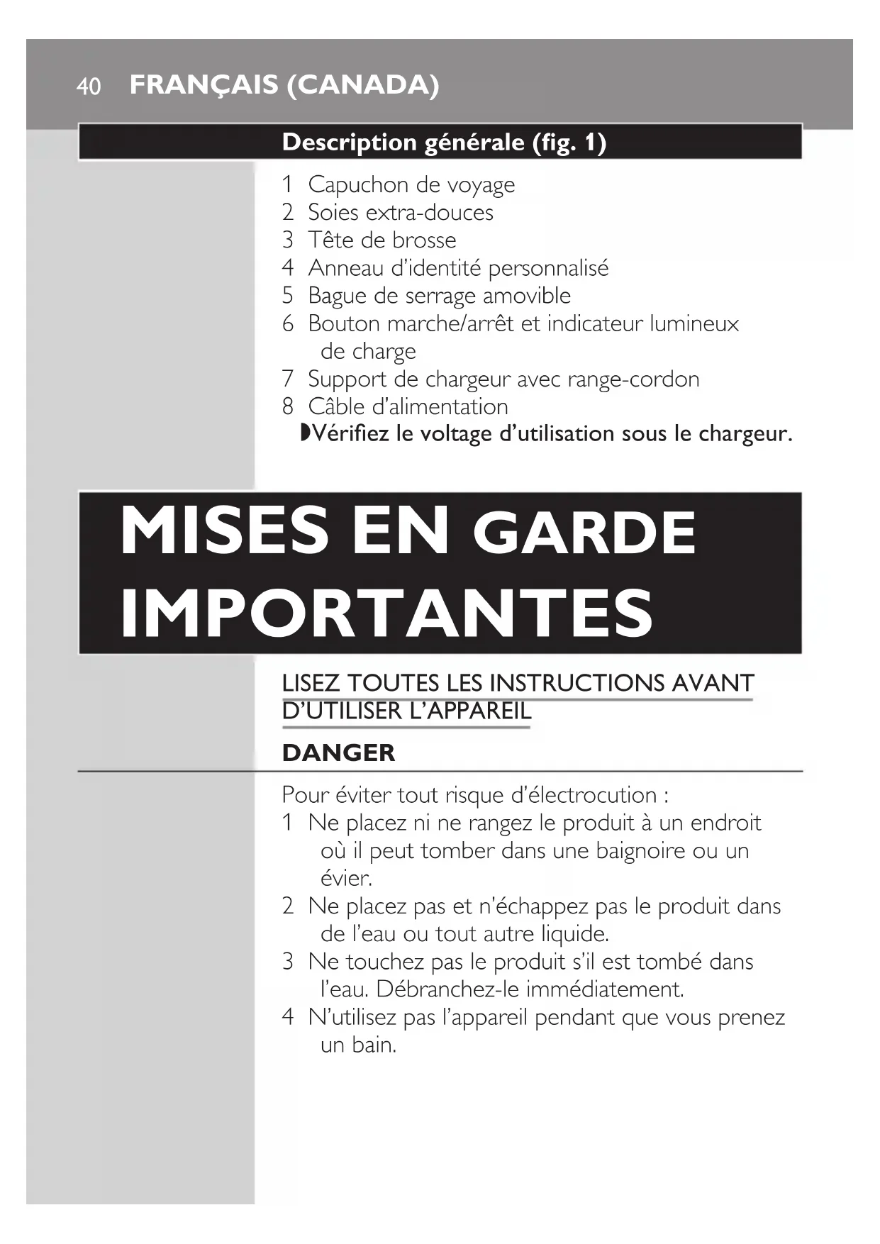 dangEr Pour éviter tout risque d’électrocution : 1 Ne placez ni ne rangez le produit à un endroit où il peut tomber dans une baignoire ou un évier. 2 Ne placez pas et n’échappez pas le produit dans de l’eau ou tout autre liquide. 3 Ne touchez pas le produit s’il est tombé dans l’eau. Débranchez-le immédiatement. 4 N’utilisez pas l’appareil pendant que vous prenez un bain. FrançaiS (Canada)aVErTiSSEMEnTS Pour éviter tout risque de brûlure, d’électrocution, d’incendie ou d’accident : 1 NE branchez PAS l’appareil sur une prise de courant dont la tension est autre que celle précisée sur la partie inférieure du chargeur. Les convertisseurs de tension NE garantissent PAS la compatibilité de tension. 2 Ne branchez jamais de force la che sur une prise de courant. Si la che ne s’insère pas facilement dans la prise, cessez d’utiliser l’appareil. 3 Cessez d’utiliser cet appareil s’il vous semble endommagé de quelque façon que ce soit (tête de brosse, manche, chargeur). Ce produit ne contient pas de pièces remplaçables. Consultez le chapitre «Garantie et service» si votre appareil Sonicare ne fonctionne plus correctement ou doit être réparé. 4 N’utilisez jamais le chargeur si le cordon d’alimentation ou la che sont endommagés. 5 Tenez le cordon d’alimentation à l’écart des surfaces chauffantes. 6 N’utilisez pas le chargeur à l’extérieur. 7 N’utilisez pas le chargeur s’il est tombé dans l’eau. 8 Évitez d’utiliser une tête de brosse dont les soies sont écrasées ou courbées. Des soies endommagées peuvent se détacher au cours du brossage. Remplacez votre tête de brosse tous les trois mois ou avant en cas d’apparition d’usure. Un brossage inadéquat peut endommager les soies de la brosse. (Voir le chapitre «Nettoyage».) FrançaiS (Canada) 419 Ce produit n’est conçu que pour le nettoyage des dents, des gencives et de la langue. Ne vous en servez que pour son utilisation prévue, tel que décrit dans cette brochure. Cessez d’utiliser ce produit et communiquez avec un médecin ou un dentiste si vous ressentez de la douleur ou un certain inconfort. 10 Cet appareil ne doit pas être utilisé par des personnes (incluant des enfants) avec des capacités physiques, sensorielles ou mentales réduites, ou qui n’ont pas l’expérience et les connaissances nécessaires, à moins qu’elles ne soient sous la surveillance d’une personne responsable de leur sécurité ou qu’elles aient reçu de cette personne des directives concernant l’utilisation de l’appareil. 11 Les enfants doivent être surveillés pour s’assurer qu’ils ne s’amusent pas avec l’appareil. 12 Sonicare est un appareil prévu pour des soins personnels et ne doit pas être utilisé par plusieurs patients dans les cabinets ou établissements dentaires. 13 N’utilisez pas d’autres accessoires ou têtes de brosse que ceux recommandés par le fabricant. 14 Si votre dentifrice contient du peroxyde d’hydrogène, du bicarbonate de soude ou tout autre bicarbonate (commun dans les dentifrices à action blanchissante), il est important que vous nettoyiez soigneusement la tête de brosse et le manche avec de l’eau et du savon après chaque utilisation an d’éviter que le plastique ne se ssure. 15 Pour éviter d’endommager le produit, ne lavez pas la tête de brosse ou le chargeur au lave- vaisselle. FrançaiS (Canada)42MISES EN GARDE D’ORDRE MÉDICAL 1 Consultez votre dentiste avant d’utiliser ce produit si vous avez subi une chirurgie buccale ou gingivale au cours des 2 derniers mois. 2 Consultez votre dentiste si vos gencives saignent anormalement après vous être brossé les dents avec cet appareil ou si le saignement persiste après une semaine d’utilisation. 3 Si vous avez un stimulateur cardiaque ou tout autre dispositif implanté, consultez votre médecin ou le fabricant du dispositif implanté avant d’utiliser cet appareil. 4 Sonicare a fait l’objet de tests et est conforme aux normes de sécurité concernant les dispositifs électromagnétiques. 5 Consultez votre médecin avant d’utiliser votre Sonicare pour toutes préoccupations d’ordre médical. CONSERVEZ CES CONSIGNES Avant l’utilisation Fixation de la tête de brosse