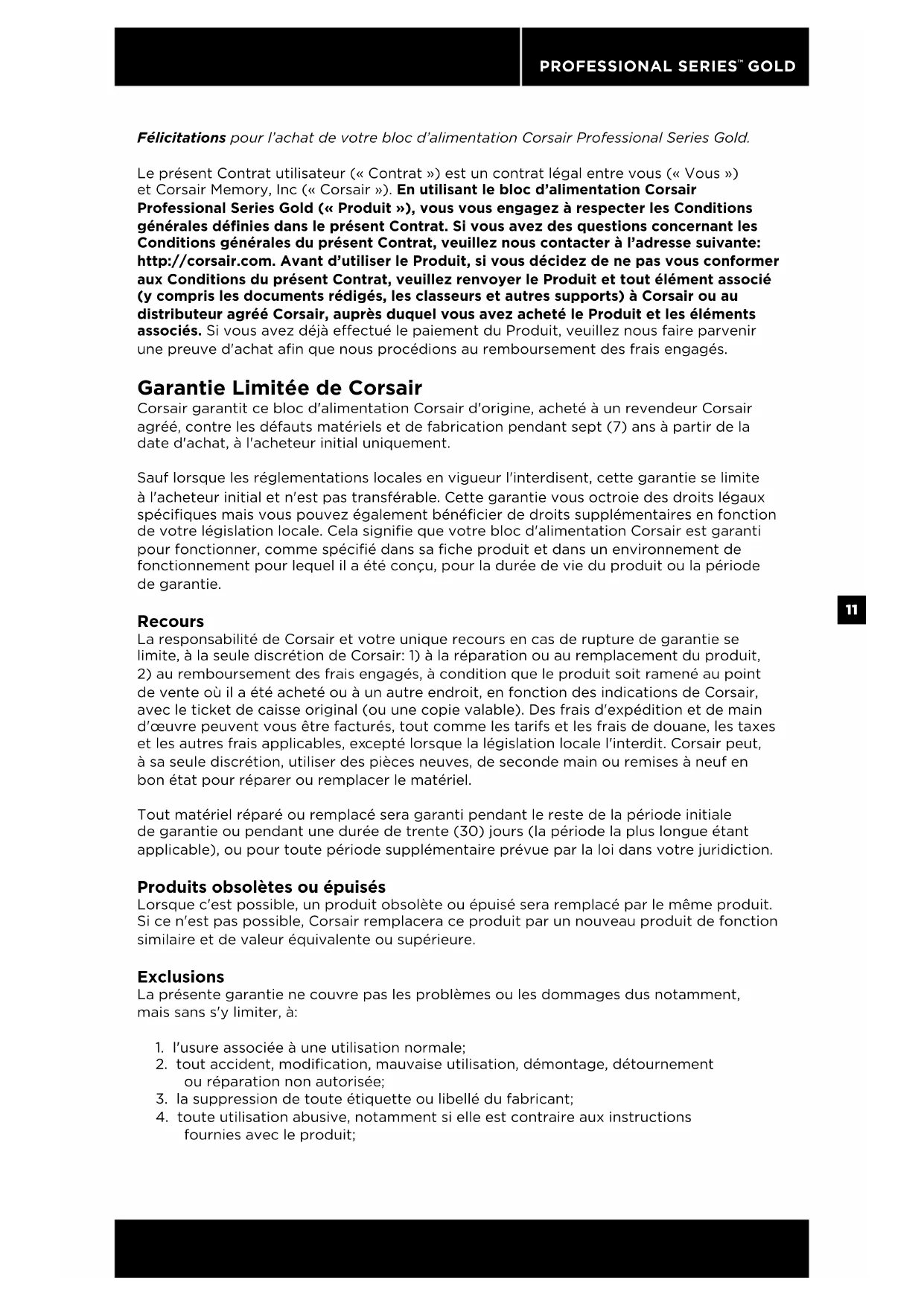 GOLD Félicitations pour l’achat de votre bloc d’alimentation Corsair Professional Series Gold. Le présent Contrat utilisateur (« Contrat ») est un contrat légal entre vous (« Vous ») et Corsair Memory, Inc (« Corsair »). En utilisant le bloc d’alimentation Corsair Professional Series Gold (« Produit »), vous vous engagez à respecter les Conditions générales définies dans le présent Contrat. Si vous avez des questions concernant les Conditions générales du présent Contrat, veuillez nous contacter à l’adresse suivante: http://corsair.com. Avant d’utiliser le Produit, si vous décidez de ne pas vous conformer aux Conditions du présent Contrat, veuillez renvoyer le Produit et tout élément associé (y compris les documents rédigés, les classeurs et autres supports) à Corsair ou au distributeur agréé Corsair, auprès duquel vous avez acheté le Produit et les éléments associés. Si vous avez déjà eectué le paiement du Produit, veuillez nous faire parvenir une preuve d'achat afin que nous procédions au remboursement des frais engagés. Garantie Limitée de Corsair Corsair garantit ce bloc d'alimentation Corsair d'origine, acheté à un revendeur Corsair agréé, contre les défauts matériels et de fabrication pendant sept (7) ans à partir de la date d'achat, à l'acheteur initial uniquement. Sauf lorsque les réglementations locales en vigueur l'interdisent, cette garantie se limite à l'acheteur initial et n'est pas transférable. Cette garantie vous octroie des droits légaux spécifiques mais vous pouvez également bénéficier de droits supplémentaires en fonction de votre législation locale. Cela signifie que votre bloc d'alimentation Corsair est garanti pour fonctionner, comme spécifié dans sa fiche produit et dans un environnement de fonctionnement pour lequel il a été conçu, pour la durée de vie du produit ou la période de garantie. Recours La responsabilité de Corsair et votre unique recours en cas de rupture de garantie se limite, à la seule discrétion de Corsair: 1) à la réparation ou au remplacement du produit,