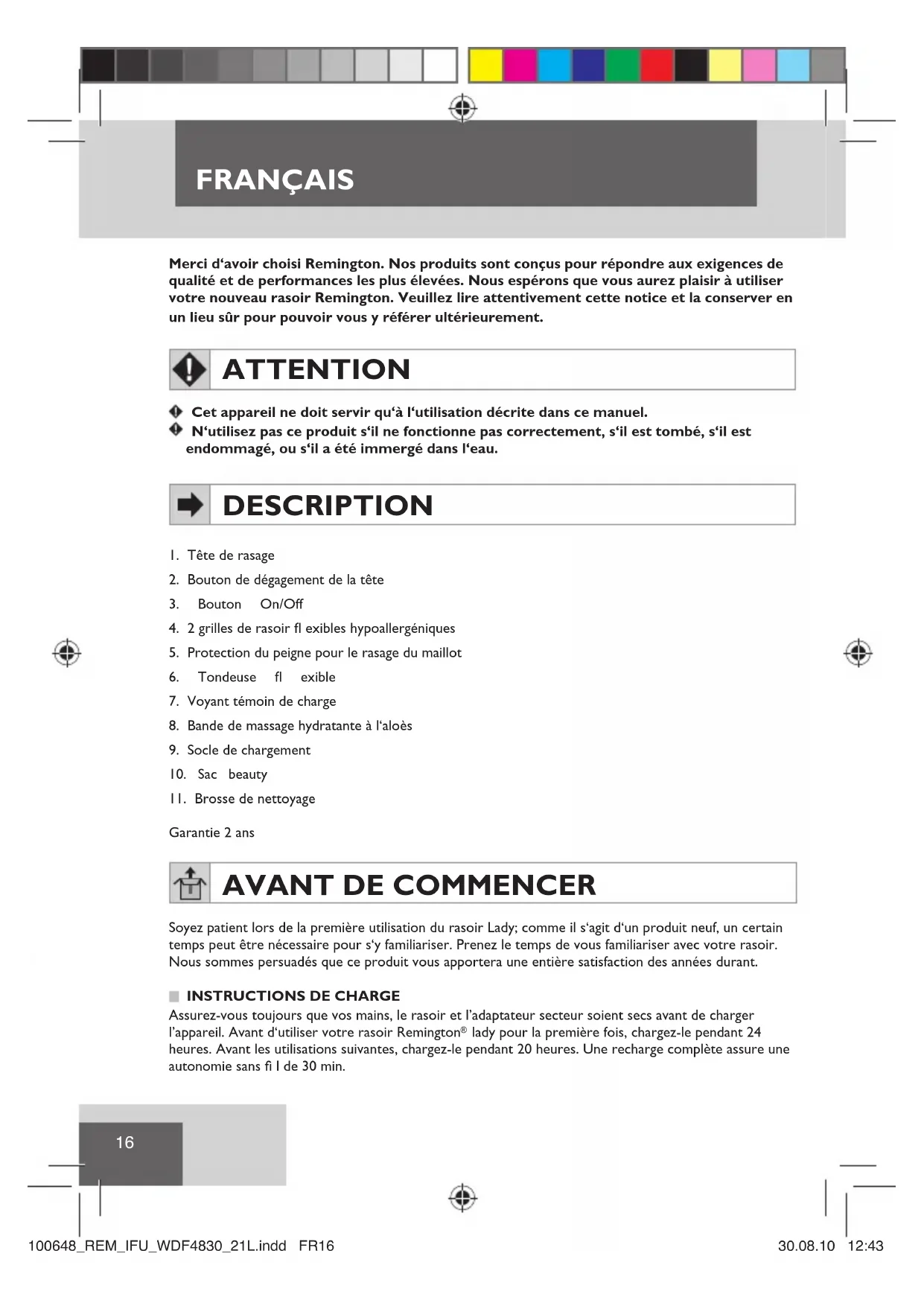 AVANT DE COMMENCER Soyez patient lors de la première utilisation du rasoir Lady; comme il s‘agit d‘un produit neuf, un certain