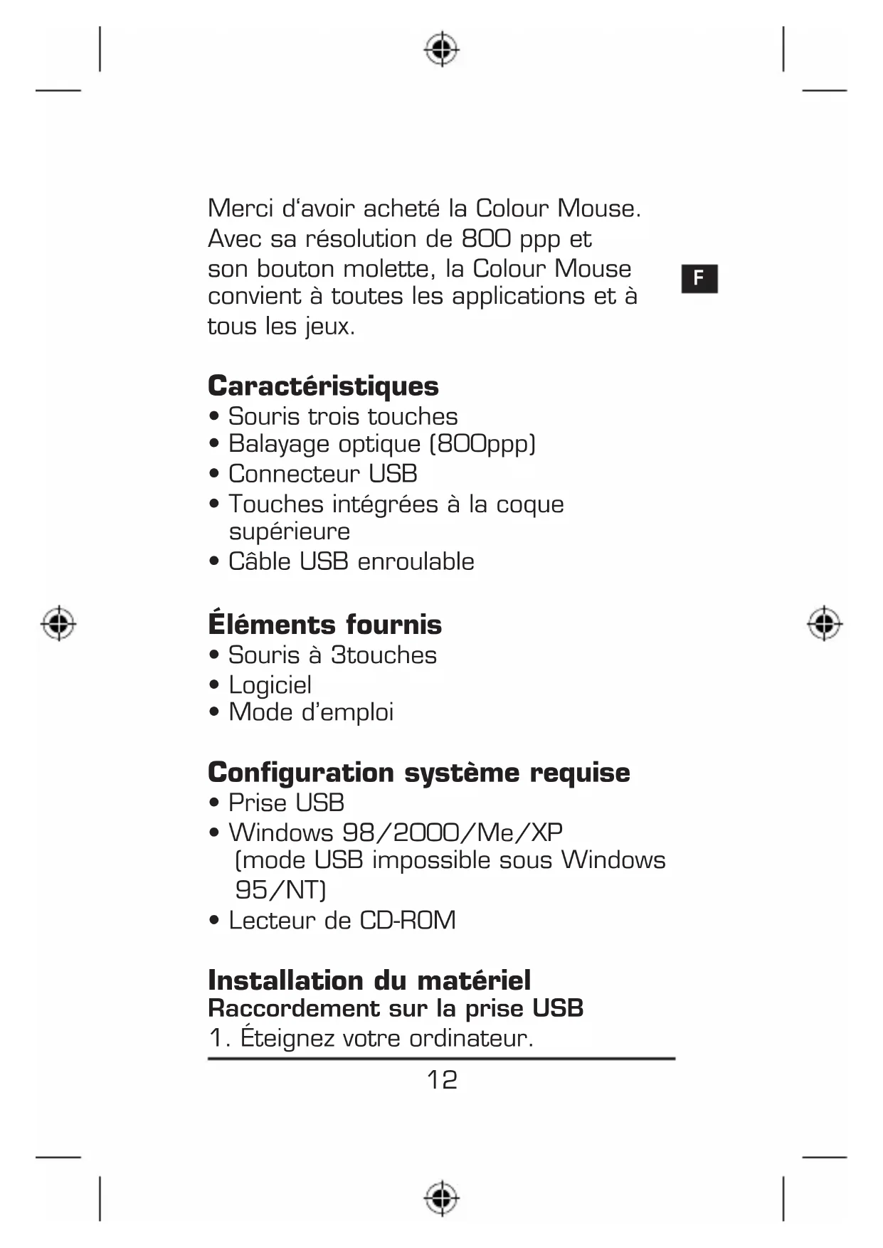 Merci d‘avoir acheté la Colour Mouse. Avec sa résolution de 800 ppp et son bouton molette, la Colour Mouse convient à toutes les applications et à tous les jeux. Caractéristiques