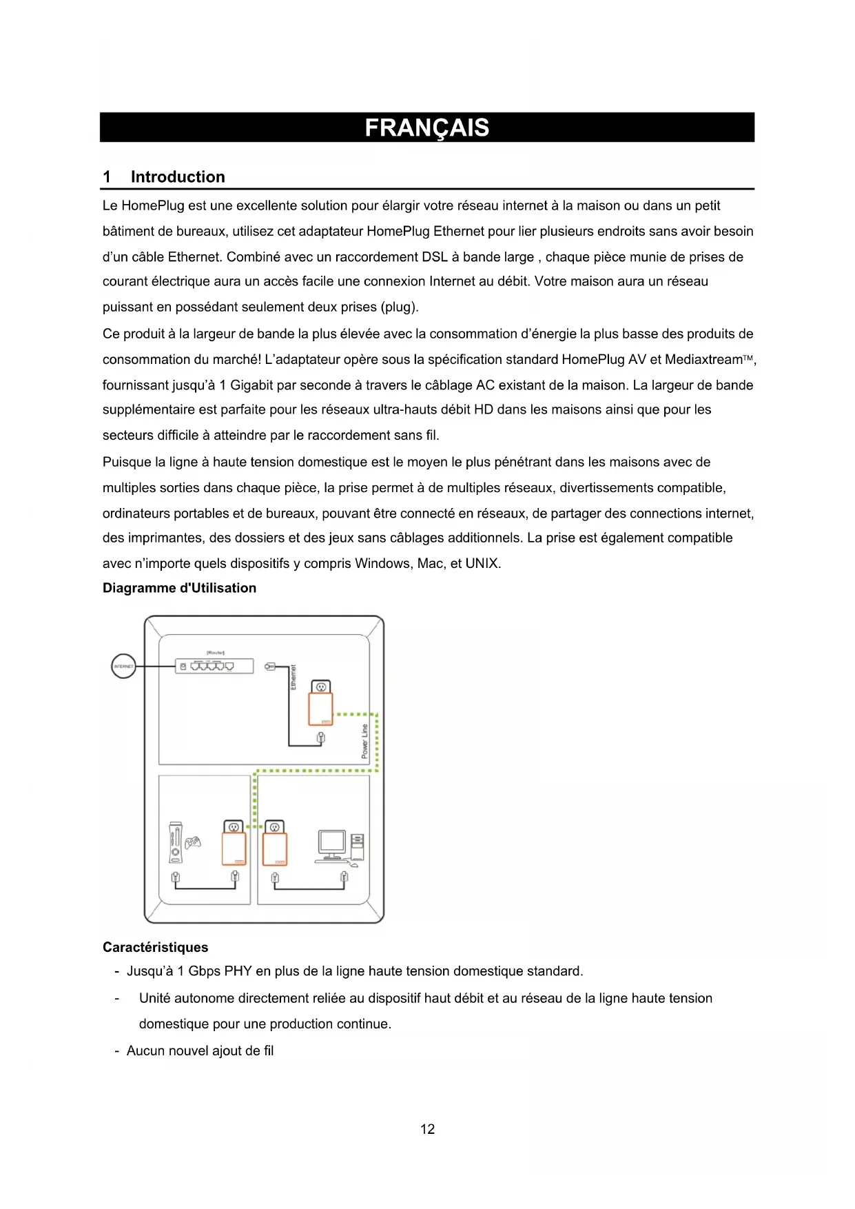 11FRANÇAIS HomePlug 1 Introduction Le HomePlug est une excellente solution pour élargir votre réseau internet à la maison ou dans un petit bâtiment de bureaux, utilisez cet adaptateur HomePlug Ethernet pour lier plusieurs endroits sans avoir besoin d’un câble Ethernet. Combiné avec un raccordement DSL à bande large , chaque pièce munie de prises de courant électrique aura un accès facile une connexion Internet au débit. Votre maison aura un réseau puissant en possédant seulement deux prises (plug). Ce produit à la largeur de bande la plus élevée avec la consommation d’énergie la plus basse des produits de consommation du marché! L’adaptateur opère sous la spécification standard HomePlug AV et Mediaxtream