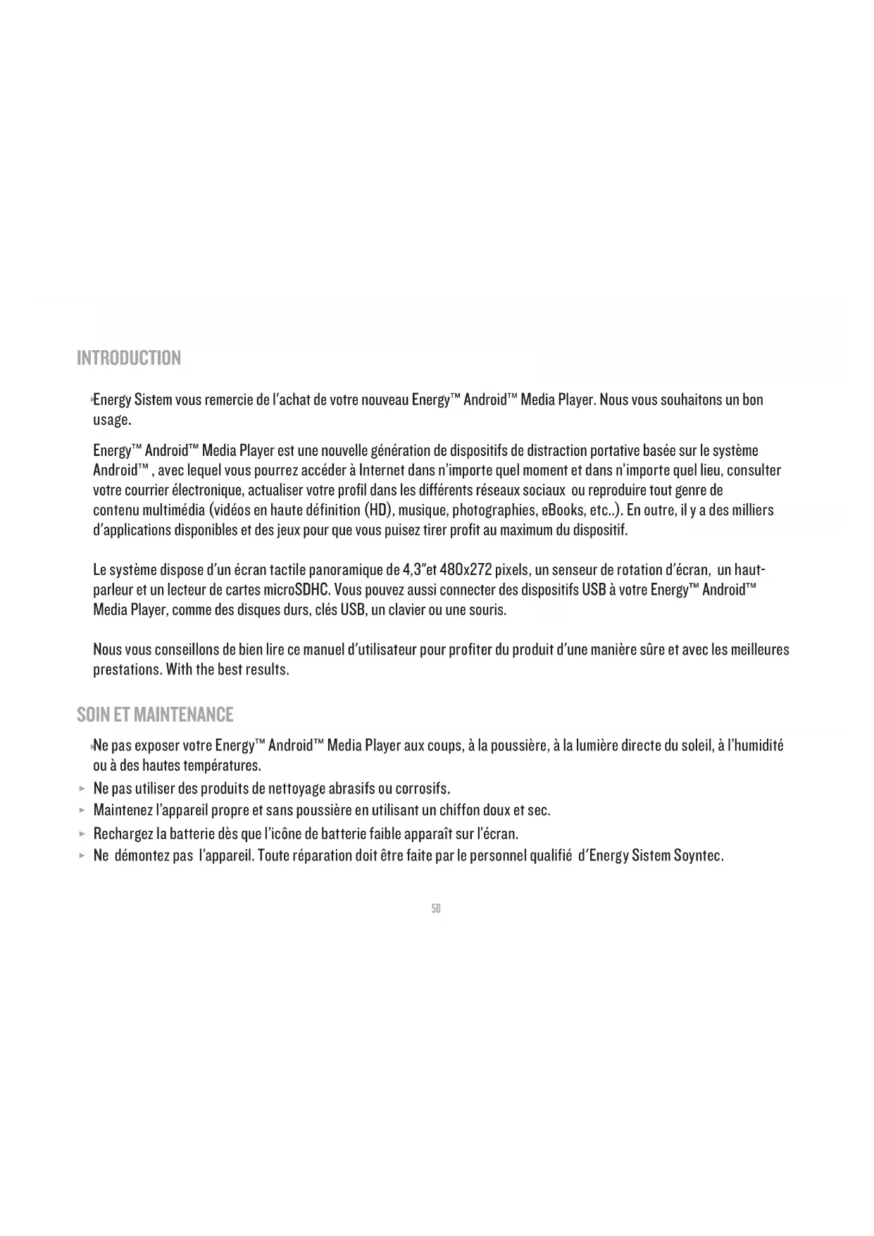 Energy Sistem vous remercie de l'achat de votre nouveau Energy™ Android™ Media Player. Nous vous souhaitons un bon usage. Energy™ Android™ Media Player est une nouvelle génération de dispositifs de distraction portative basée sur le système Android™ , avec lequel vous pourrez accéder à Internet dans n’importe quel moment et dans n’importe quel lieu, consulter votre courrier électronique, actualiser votre profil dans les différents réseaux sociaux ou reproduire tout genre de contenu multimédia (vidéos en haute définition (HD), musique, photographies, eBooks, etc..). En outre, il y a des milliers d'applications disponibles et des jeux pour que vous puisez tirer profit au maximum du dispositif. Le système dispose d'un écran tactile panoramique de 4,3"et 480x272 pixels, un senseur de rotation d'écran, un haut- parleur et un lecteur de cartes microSDHC. Vous pouvez aussi connecter des dispositifs USB à votre Energy™ Android™ Media Player, comme des disques durs, clés USB, un clavier ou une souris. Nous vous conseillons de bien lire ce manuel d'utilisateur pour profiter du produit d'une manière sûre et avec les meilleures prestations. With the best results.