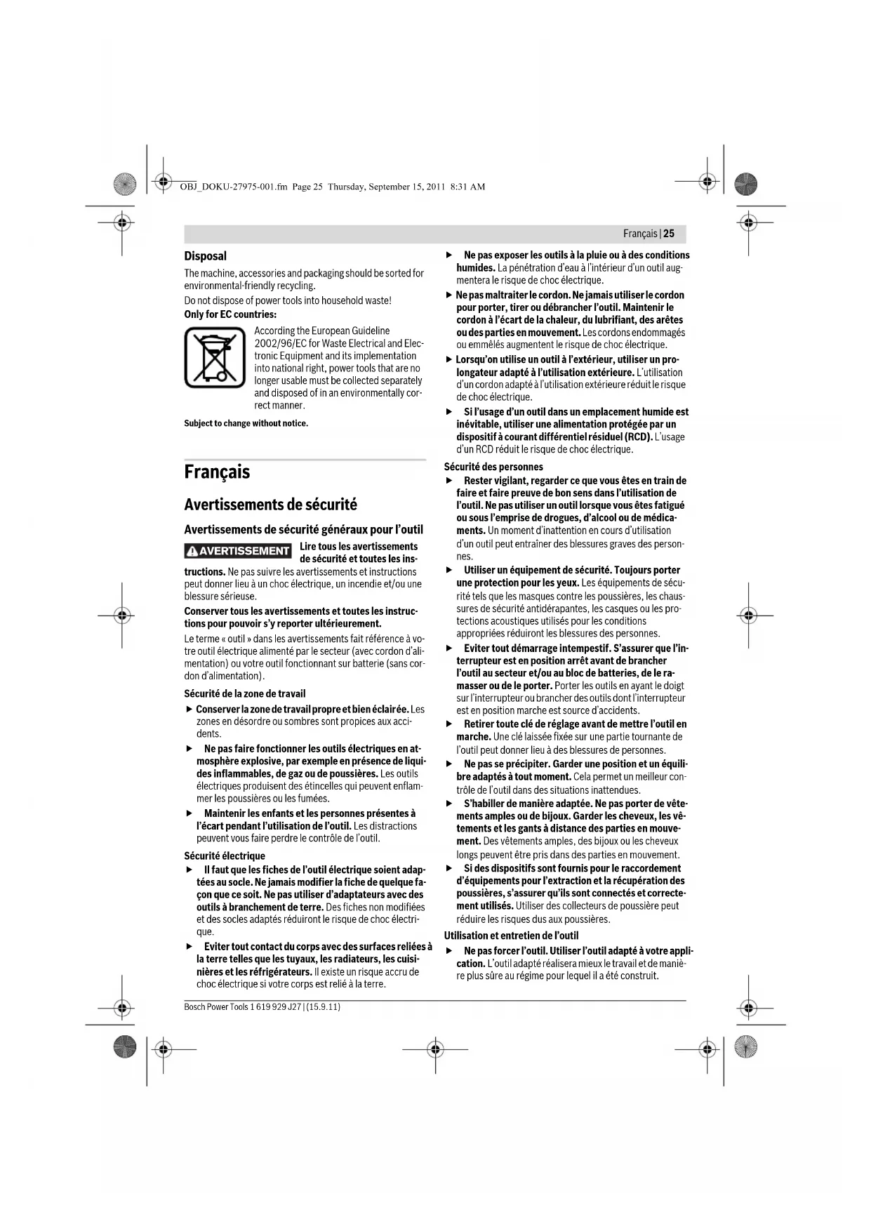 OBJ_DOKU-27975-001.fm Page 34 Thursday, September 15, 2011 8:31 AMEspañol | 35 Bosch Power Tools 1 619 929 J27 | (15.9.11) Seulement pour les pays de l’Union Européenne :