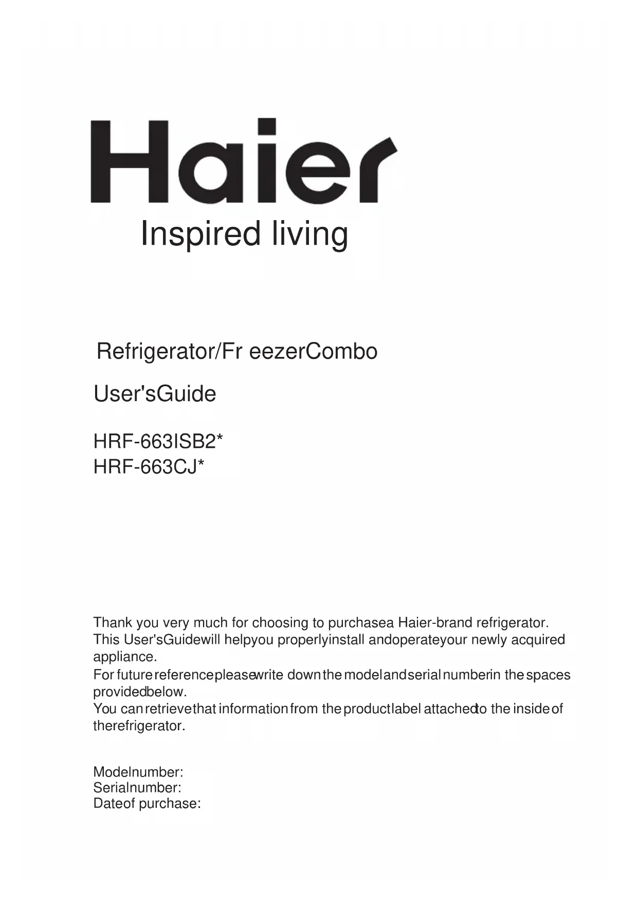 you purchased it.Nous vous remercions d'avoir fait l'acquisition d'un réfrigérateur de marque Haier.