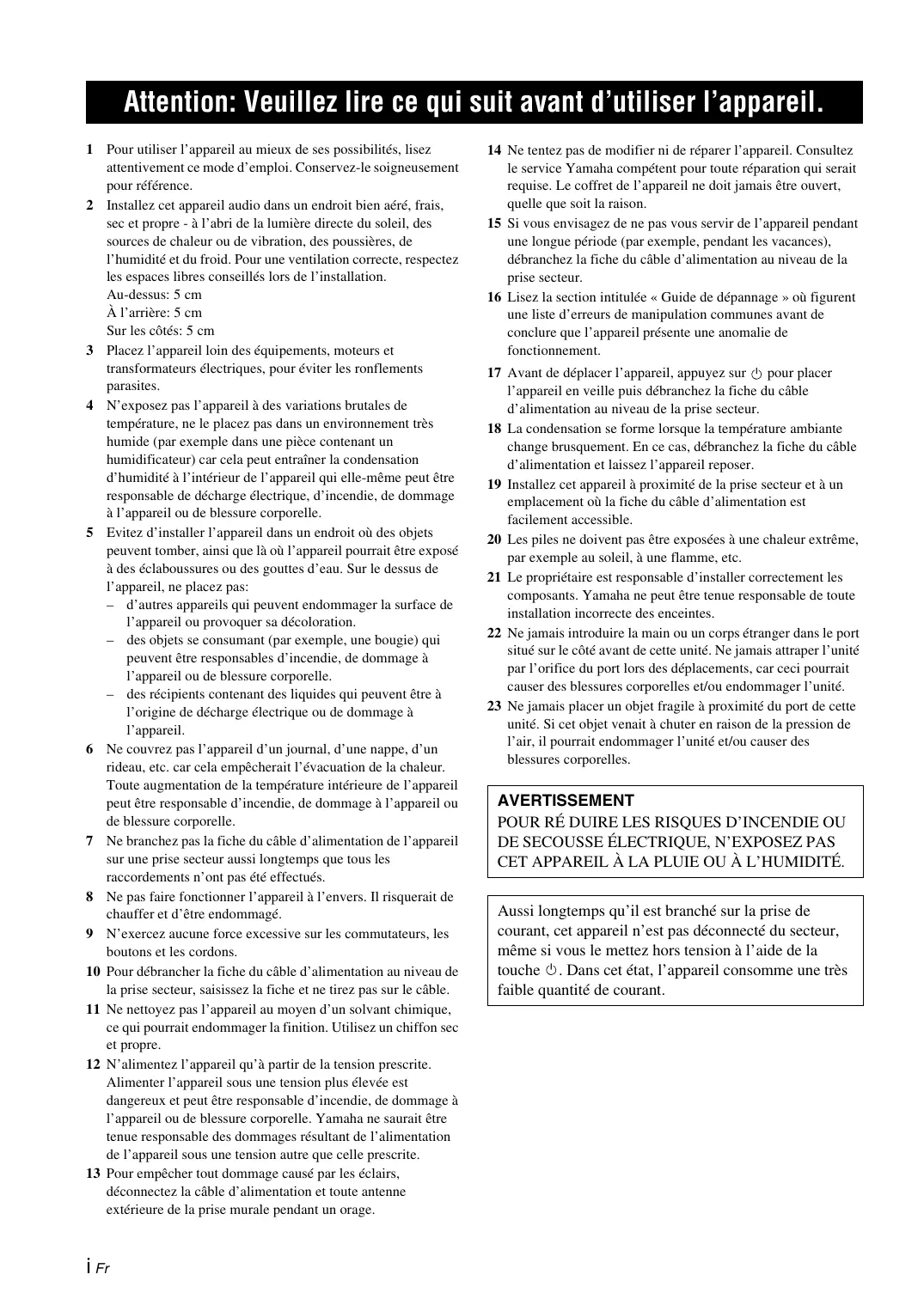 1 Pour utiliser l’appareil au mieux de ses possibilités, lisez attentivement ce mode d’emploi. Conservez-le soigneusement pour référence. 2 Installez cet appareil audio dans un endroit bien aéré, frais, sec et propre - à l’abri de la lumière directe du soleil, des sources de chaleur ou de vibration, des poussières, de l’humidité et du froid. Pour une ventilation correcte, respectez les espaces libres conseillés lors de l’installation. Au-dessus: 5 cm À l’arrière: 5 cm Sur les côtés: 5 cm 3 Placez l’appareil loin des équipements, moteurs et transformateurs électriques, pour éviter les ronflements parasites. 4 N’exposez pas l’appareil à des variations brutales de température, ne le placez pas dans un environnement très humide (par exemple dans une pièce contenant un humidificateur) car cela peut entraîner la condensation d’humidité à l’intérieur de l’appareil qui elle-même peut être responsable de décharge électrique, d’incendie, de dommage à l’appareil ou de blessure corporelle. 5 Evitez d’installer l’appareil dans un endroit où des objets peuvent tomber, ainsi que là où l’appareil pourrait être exposé à des éclaboussures ou des gouttes d’eau. Sur le dessus de l’appareil, ne placez pas: – d’autres appareils qui peuvent endommager la surface de l’appareil ou provoquer sa décoloration. – des objets se consumant (par exemple, une bougie) qui peuvent être responsables d’incendie, de dommage à l’appareil ou de blessure corporelle. – des récipients contenant des liquides qui peuvent être à l’origine de décharge électrique ou de dommage à l’appareil. 6 Ne couvrez pas l’appareil d’un journal, d’une nappe, d’un rideau, etc. car cela empêcherait l’évacuation de la chaleur. Toute augmentation de la température intérieure de l’appareil peut être responsable d’incendie, de dommage à l’appareil ou de blessure corporelle. 7 Ne branchez pas la fiche du câble d’alimentation de l’appareil sur une prise secteur aussi longtemps que tous les raccordements n’ont pas été effectués. 8 Ne pas faire fonctionner l’appareil à l’envers. Il risquerait de chauffer et d’être endommagé. 9 N’exercez aucune force excessive sur les commutateurs, les boutons et les cordons. 10 Pour débrancher la fiche du câble d’alimentation au niveau de la prise secteur, saisissez la fiche et ne tirez pas sur le câble. 11 Ne nettoyez pas l’appareil au moyen d’un solvant chimique, ce qui pourrait endommager la finition. Utilisez un chiffon sec et propre. 12 N’alimentez l’appareil qu’à partir de la tension prescrite. Alimenter l’appareil sous une tension plus élevée est dangereux et peut être responsable d’incendie, de dommage à l’appareil ou de blessure corporelle. Yamaha ne saurait être tenue responsable des dommages résultant de l’alimentation de l’appareil sous une tension autre que celle prescrite. 13 Pour empêcher tout dommage causé par les éclairs, déconnectez la câble d’alimentation et toute antenne extérieure de la prise murale pendant un orage.
