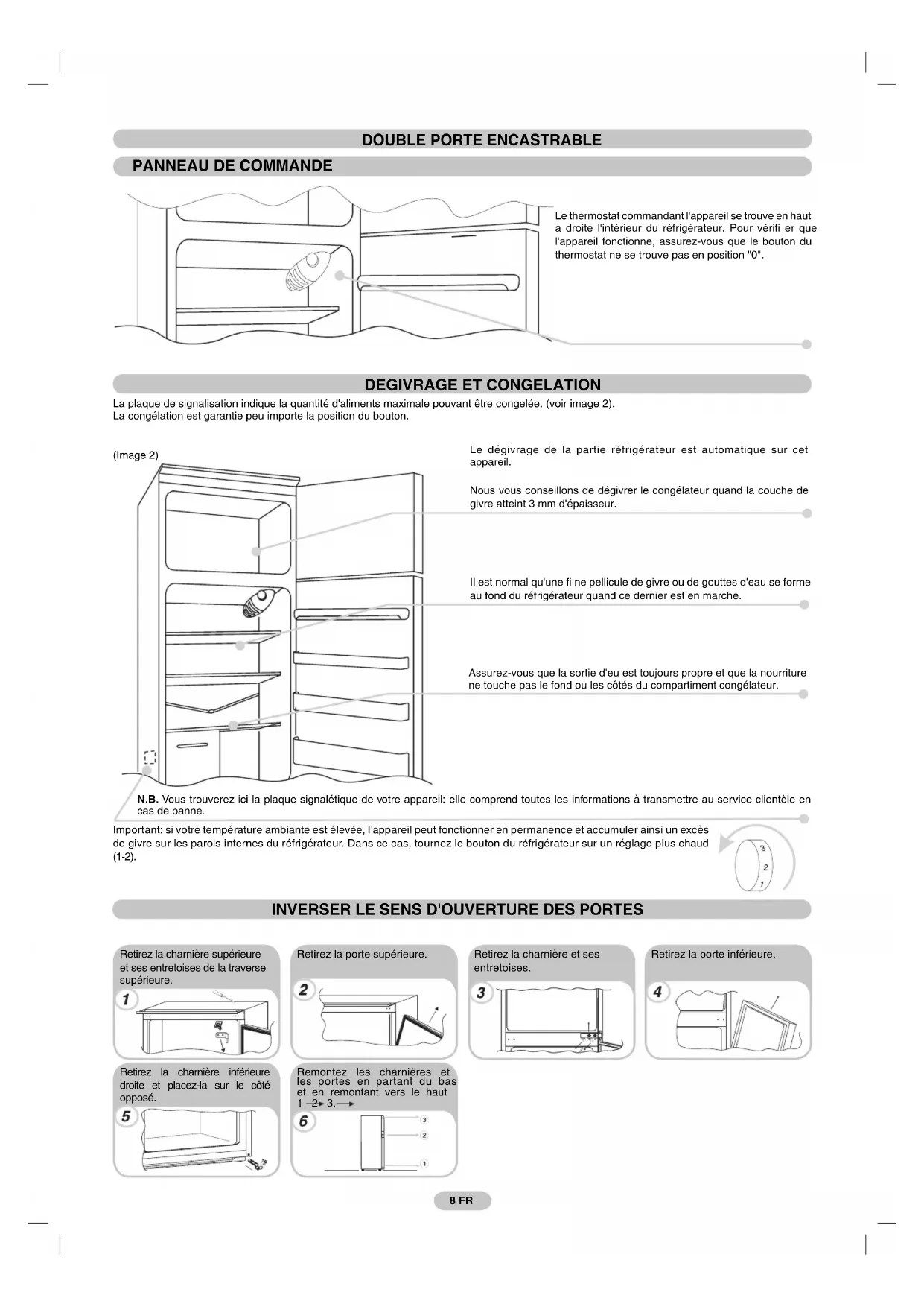 PRECAUTIONS FOR THE CORRECT OPERATION Dimensions of the column lock-pickings.DOUBLE PORTE ENCASTRABLE INVERSER LE SENS D'OUVERTURE DES PORTES PANNEAU DE COMMANDE Le thermostat commandant l'appareil se trouve en haut