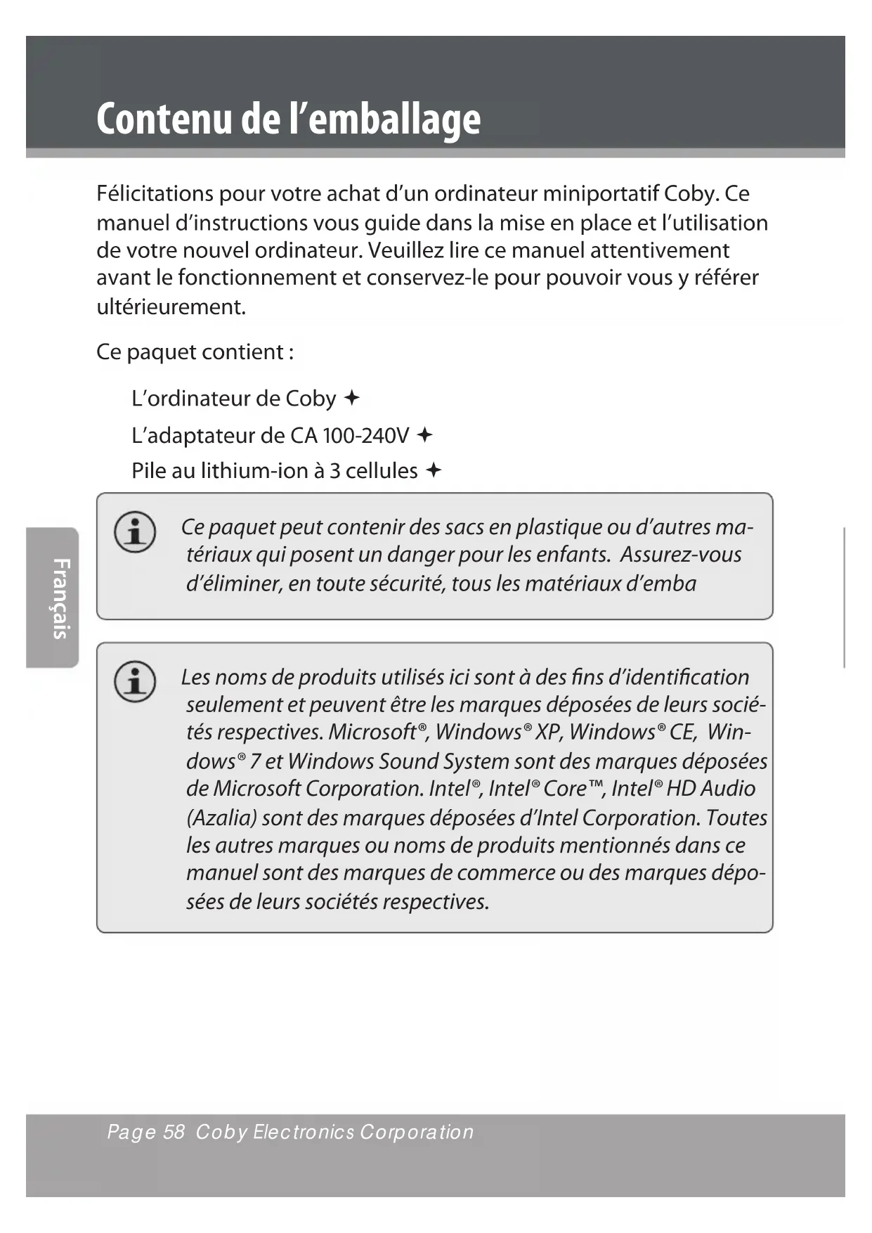 - Verrou de pile (manuel)1. Bloc-piles2. Verrou de pile (automatique/à 3. ressort) Ventilation4. Compartiment de disque dur5. Ne tentez pas de démonter ou de remplacer votre disque dur. Pour obtenir de l’aide avec le remplacement ou la réparation de disque dur, contactez un professionnel qualié. Pour éviter toute surchaue, ne pas bloquer cette ventilation lorsque l’ordinateur est en cours d’utilisation.Page 66 Coby Electronics Corporation Français www.cobyusa.com Page 67 Opération de base Alimentation Votre ordinateur inclut à la fois un adaptateur CA et une pile au lithi- um-ion intégrée, rechargeable pour une portabilité maximale. Alimentation CA Utilisez l’adaptateur CA pour faire fonctionner votre ordinateur sur l’alimentation CA et recharger la pile. Pour connecter l’adaptateur CA : Branchez le cordon d’alimentation au pack de transformateur. Branchez le cordon d’alimentation dans une prise de courant. Branchez l’adaptateur CA au jack d’adaptateur d’alimentation CA de l’ordinateur. Puissance de Pile Assurez-vous que la pile est complètement chargée avant la première utilisation. L’indicateur de l’état de puissance de la pile clignotera lorsque la batterie est à un niveau faible. Branchez l’adaptateur CA comme indiqué ci-dessus pour recharger la pile. Pour remplacer la pile : Éteignez l’ordinateur et débranchez tous les câbles, y compris le cordon d’alimentation CA. Retournez l’ordinateur pour accéder au déclencheur de pile. Faites glisser le loquet de déclencheur de pile à la position de déverrouil- lage et maintenez. Faites glisser la pile. Faites glisser la pile de remplacement dans la baie jusqu’à ce qu’elle s’enclenche en place. Faites glisser le loquet de déclencheur à la position verrouillée.Page 66 Coby Electronics Corporation www.cobyusa.com Page 67 Français Opération de base Les composants et programmes sur votre ordinateur consom- ment de la puissance à des débits diérents. L’utilisation de com- posants/programmes consommant beaucoup de puissance causera à la pile de se vider plus rapidement. Le système d’exploitation de votre ordinateur peut fonctionner plus lentement lors d’un fonctionnement à partir de la pile. Utilisez uniquement des bloc-piles approuvés pour alimenter votre ordinateur. L’utilisation d’une pile incompatible peut aug- menter le risque d’incendie ou d’explosion. Ne tentez pas de démonter ou de modier le bloc-piles. Un bloc- piles autre que celui spécié par nous-même, ou un bloc-piles démonté ou modié, n’est pas couvert par la garantie. Lors de l’élimination de la pile, se conformer aux ordonnances et règlements locaux. Ne tentez pas de jeter la pile dans votre poubelle de maison.Page 68 Coby Electronics Corporation Français www.cobyusa.com Page 69 Opération de base Comment Démarrer Ouvrez le ordinateur et réglez le panneau d’achage pour une vision confortable. Comment Allumer Votre Ordinateur Appuyez sur le bouton marche/arrêt pour allumer l’ordinateur. Mode Sommeil Lorsque vous avez ni de travailler sur votre ordinateur, vous pouvez le mettre en mode sommeil ou l’éteindre. Utilisez le mode sommeil si vous allez être loin de votre ordinateur pendant peu de temps. Pour entrer en mode sommeil : Cliquez sur le menu Démarrer et sélectionnez Sommeil, ou Appuyez sur Fn + Esc (Ech). Pour réveiller l’ordinateur, appuyez sur le bouton Marche/Arrêt. Attendez que le voyant d’indicateur de puissance commence à clignoter (indiquant que l’ordinateur est en mode sommeil) avant de déplacer votre ordinateur. Le déplacement de votre ordinateur pendant que le disque dur tourne peut causer des dommages ou une perte de données. Eteindre l’Ordinateur Votre ordinateur devrait être éteint lorsqu’il n’est pas utilisé pendant 24 heures ou plus. Entrez dans le menu Démarrer et sélectionnez Eteindre pour éteindre l’ordinateur.Page 68 Coby Electronics Corporation www.cobyusa.com Page 69 Français Opération de base Fonctions de Clavier Le clavier standard de votre ordinateur intègre un pavé numérique et des touches de fonction. Combinaisons de Touche de Fonction Les touches de fonction vous permettent de changer instantanément les caractéristiques d’exploitation de votre ordinateur. Voir ci-dessous pour plus d’informations sur l’utilisation de combinaisons de touche de fonction. Key Description Fn + Esc (Ech) Met votre ordinateur en mode sommeil. Fn + F1 Activation / désactivation de l’Internet sans l intégré. Fn + F3 Mute (Silence). Fn + F4 Activation / désactivation du pavé tactile. Fn + F5 Bascule à d’autres dispositifs d’achage connectés, par exemple à un autre moniteur. Fn + F6 Diminution de la luminosité de l’achage. Fn + F7 Augmentation de la luminosité de l’achage. Fn + F8 Diminution du volume de l’ordinateur. Fn + F9 Augmentation du volume de l’ordinateur. Fn + F10 Allume/Eteint l’écran ACL. Fn + Ins/NumLk (Ver- rouillage Numérique) Activation / désactivation du pavé numérique.Page 70 Coby Electronics Corporation Français www.cobyusa.com Page 71 Pavé numérique Lorsque cette option est activée, les touches indiquées ci-dessous peuvent être utilisées comme un pavé numérique de 10 touches. Pour activer ou désactiver le pavé numérique, appuyez sur Fn+Ins/NumLk (Verrouillage Numérique). Opération de basePage 70 Coby Electronics Corporation www.cobyusa.com Page 71 Français Opération de base Comment Utiliser le Pavé Tactile Utilisez le pavé tactile et la souris intégrée pour naviguer dans le système d’exploitation de votre ordinateur. Pour déplacer le curseur sur l’écran, faites glisser votre doigt sur le pavé tactile dans la direction vers laquelle vous voulez déplacer le curseur. Utilisez les boutons de clic gauche/droit sur la souris intégrée, comme vous le feriez sur une souris normale pour sélectionner des objets, ouvrir des programmes, ou récupérer des in